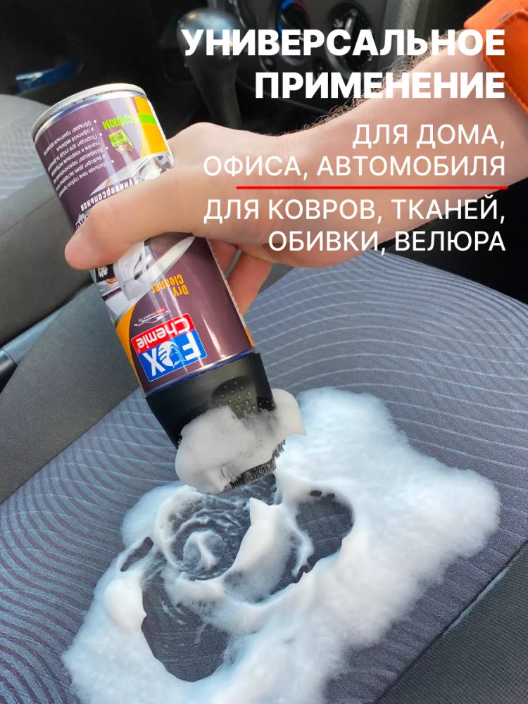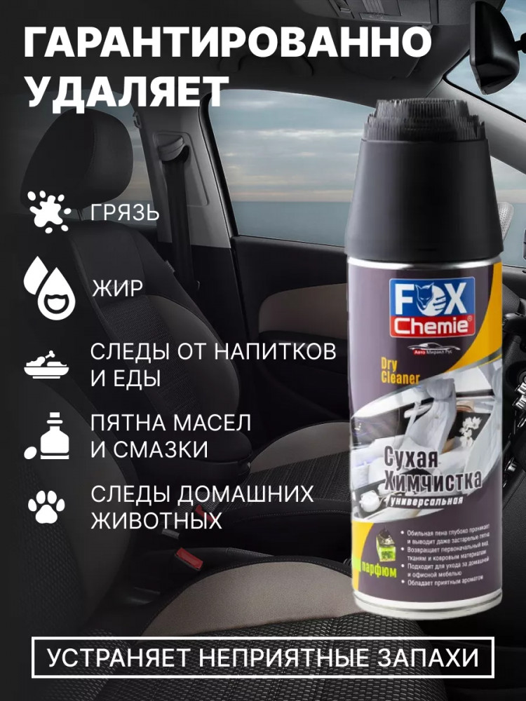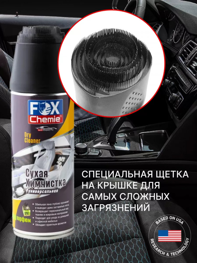 Универсальный очиститель для автомобильного и бытового применения. Сухая химчистка- это эффективное средство для очистки обивки салона автомобиля легкой и средней степени загрязнения. Предназначен для очистки салона авто от разнообразных загрязнений и пятен мебельной обивки, ковров, тканей и т. д. Химчистка освежит внешний вид покрытий, вернет обивке естественный цвет и яркость, а также удалит пыль. Защищает обивку от выцветания и воздействия ультрафиолетовых лучей. Пенная формула состава оставляет обработанную поверхность практически сухой. Сухая химчистка может использоваться в быту. Также рекомендуем использовать сухую химчистку ы холодные времена года, так как после нее не нужно сушить салон, как после влажной мойки. Обладает приятным ароматом. Крышка выполнена в виде специальной щетки, которой удобно удалять загрязнения с поверхности.