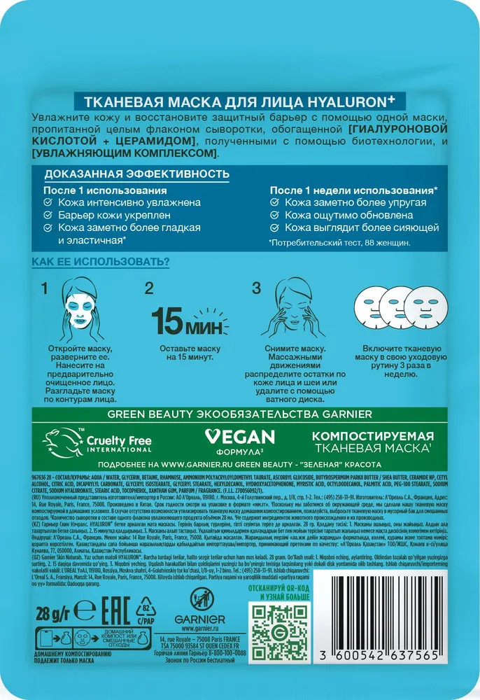 Garnier Маска для лица увлажняющая и восстанавливающая защитный барьер «Hyaluron+»