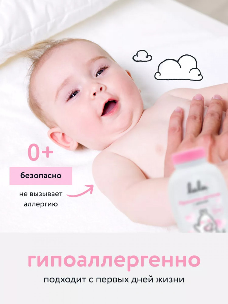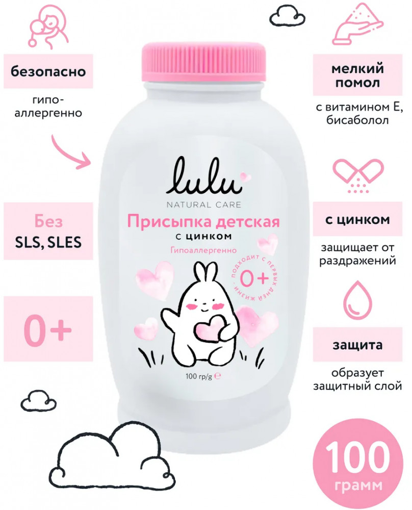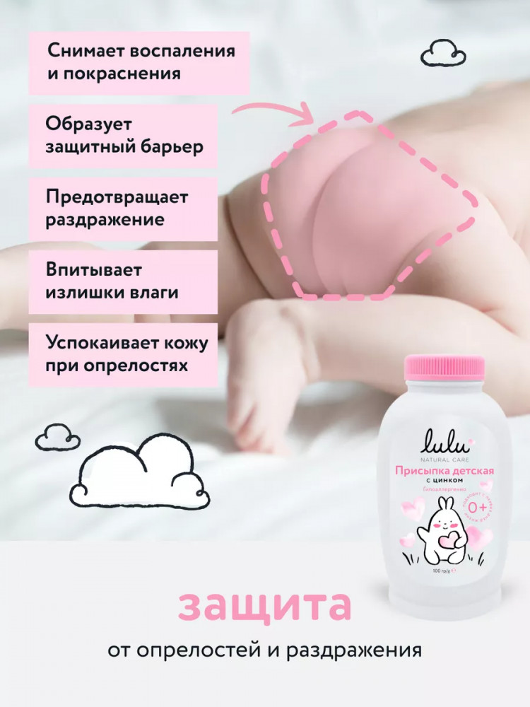 Присыпка детская для новорожденных Lulu — это эффективное и безопасное средство для ухода за нежной кожей малыша с первых дней жизни. Присыпка детская помогает предотвратить появление опрелостей и раздражения, а также обеспечивает комфорт и защиту кожи ребёнка. Детская присыпка с цинком создаёт защитный барьер на коже, предотвращая раздражение в местах естественных складок. Цинк оказывает антисептическое и подсушивающее действие. Присыпка для новорожденных Lulu в своём составе содержит тальк, который впитывает влагу, не допуская образование пота и опрелостей. Тальк присыпка гипоаллергенна и подходит для использования у детей с первых дней жизни. Наша детская присыпка не имеет в своём составе красителей, консервантов и отдушек, что делает продукт безопасным для чувствительной детской кожи. Присыпка Lulu — это надёжное средство для профилактики опрелостей, которое поможет сохранить кожу малыша здоровой и защищённой.