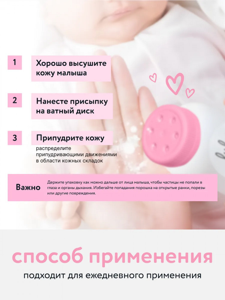Способ применения: перед нанесением присыпки на кожу, поверхность должна быть хорошо высушена. Нанести присыпку на ватный диск и распределить припудривающими движениями в области кожных складок, не оставляя на коже комочков.