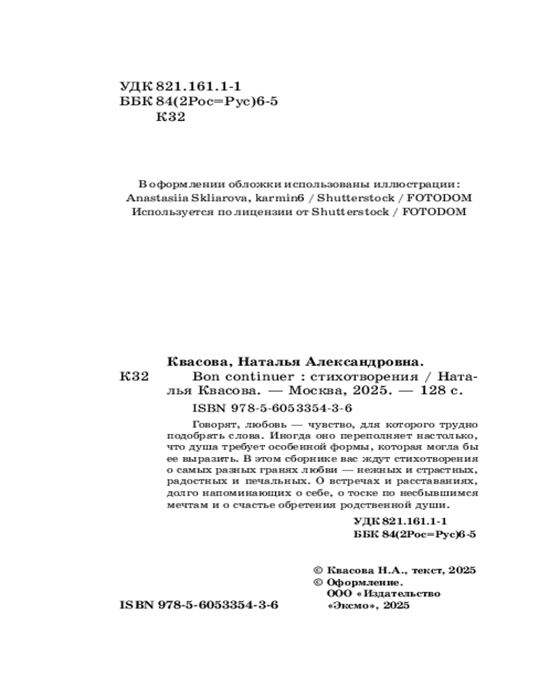 Серия: Наталья Квасова. Цикл романов Новый поэтический сборник Натальи Квасовой — автора романов «Влюбленная в масона», «Влюбленная в науку» и других. В нем любовь вновь становится главной темой и примеряет на себя разные образы, то даруя счастье и надежду, то погружая сердце в печаль и сомнения. Каждое стихотворение — это попытка запечатлеть неуловимое чувство, которое не хочется забывать, и поделиться ими с теми, кто, возможно, уже пережил или только проживает похожие моменты в своей жизни. |