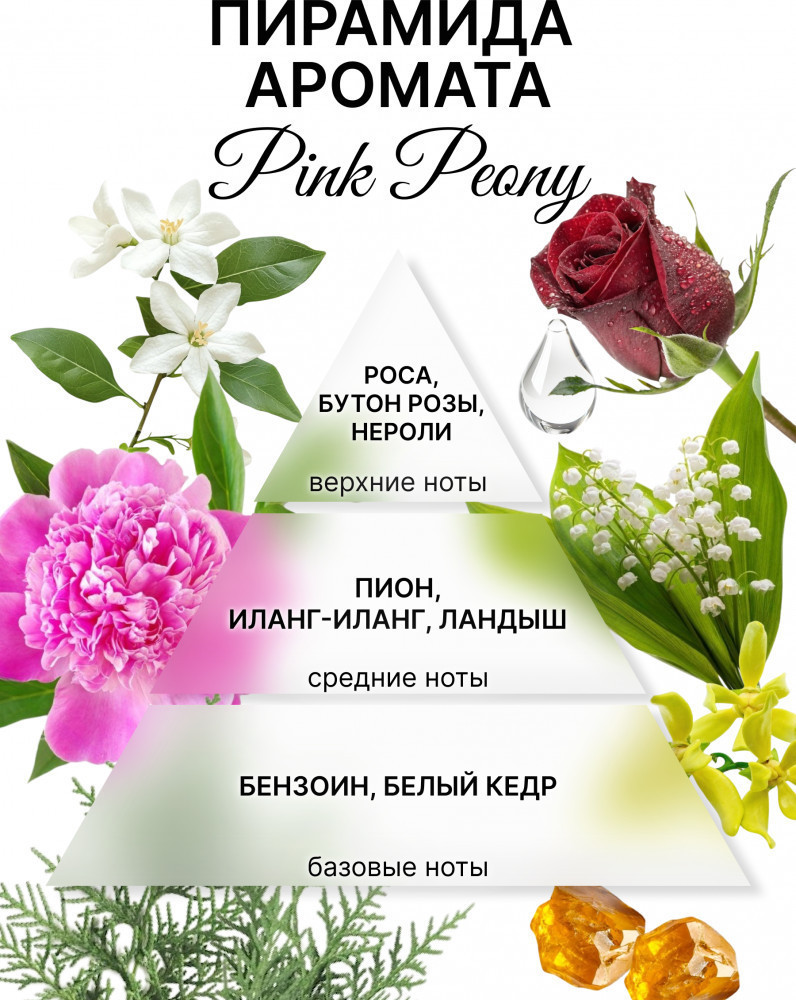 Привлекающий аромат. Ароматическая свеча «Розовый пион» наполняет пространство утонченным и цветочным ароматом пиона, который дарит свежесть и лёгкость. Этот аромат вызывает ассоциации с весной, цветущими садами и теплом, он наполнит ваш дом атмосферой гармонии и покоя. Идеально подходит для создания расслабляющей обстановки, вечерних встреч или романтических ужинов.