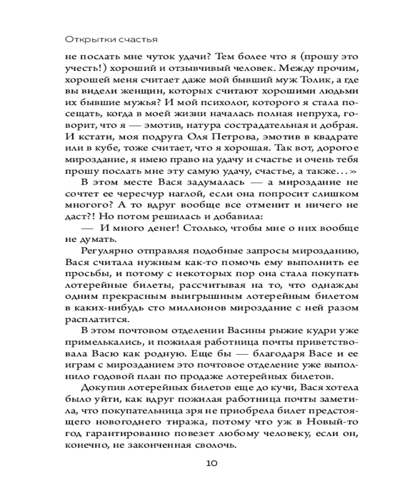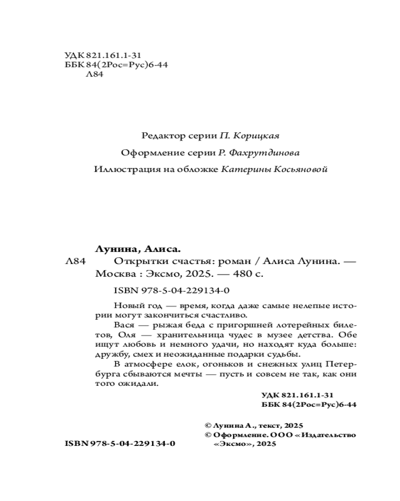 Серия: Открытки счастья. Душевные романы Новый год — время, когда даже самые нелепые истории могут закончиться счастливо. Вася — рыжая беда с пригоршней лотерейных билетов, Оля — хранительница чудес в музее детства. Обе ищут любовь и немного удачи, но находят куда больше: дружбу, смех и неожиданные подарки судьбы. В атмосфере ёлок, огоньков и снежных улиц Петербурга сбываются мечты — пусть и совсем не так, как они того ожидали. |