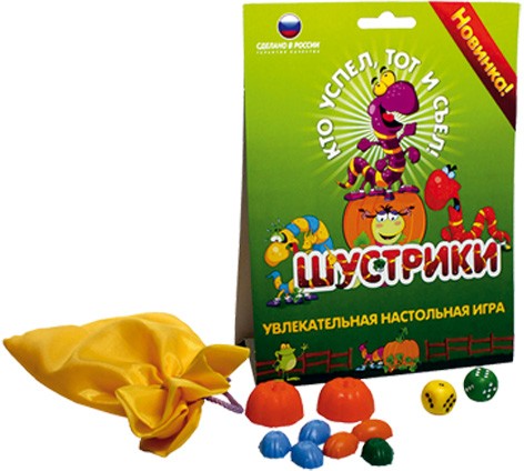 Комплектация: игровое поле, фишки «Шустрики» - 32 шт., фишки «Тыковки» - 4 шт., игровые кубики - 2 шт., фирменный мешочек, буклет с правилами.