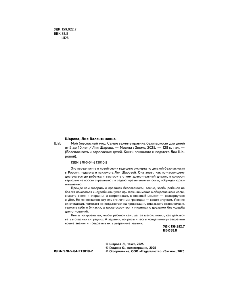 💳 Оплатить за товар можно при получении 🇰🇿 Есть бесплатная доставка по Казахстану от 1 дня 🎁 Копите бонусы с каждой покупки Серия: Безопасность и взросление детей. Книги психолога и педагога Лии Шаровой Нам важно научить детей безопасности. Но прежде чем объяснять, как разговаривать со взрослыми и что делать в экстренной ситуации, нужно, чтобы ребенок не боялся показаться «неудобным»: умел привлечь внимание в общественном месте, сказать «нет» и старшим, и сверстникам, в опасный момент — развернуться и уйти. Самое важное — научить детей личным границам: своим и чужим. Именно умение их отстаивать поможет не вестись на провокации сверстников, уметь отказывать незнакомцам, уважать себя и близких, а также правильно ссориться и мириться с друзьями. |
