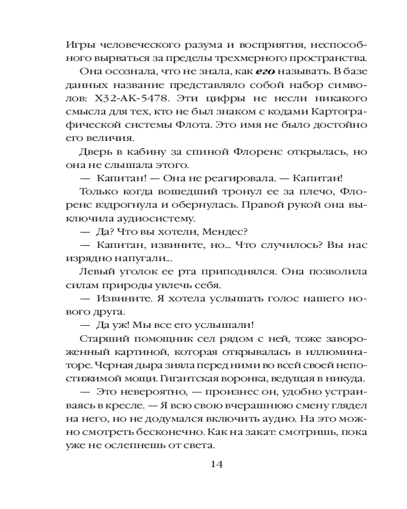 Серия: Fanzon. Хроники будущего. Главные новинки зарубежной фантастики Благодаря изобретению антигравитационного двигателя, который позволил совершать скачки сквозь пространство, к 2560 году человечество освоило больше восьми тысяч планет, но не собирается почивать на лаврах. Капитану звездолета «Банши» Флоренс Скиапарелли, более известной во Флоте как Полуживая Флоренс, поручена миссия — собрать максимум информации о черной дыре с кодовым названием «Божье Око». Но у горизонта событий черной дыры обнаруживается неопознанный корабль, и капитану Скиапарелли предстоит принять решение — пойти на риск ради спасения экипажа таинственного судна, которое в принципе не могло находиться в фотонной сфере черной дыры, или уйти с результатами собственных научных исследований. |