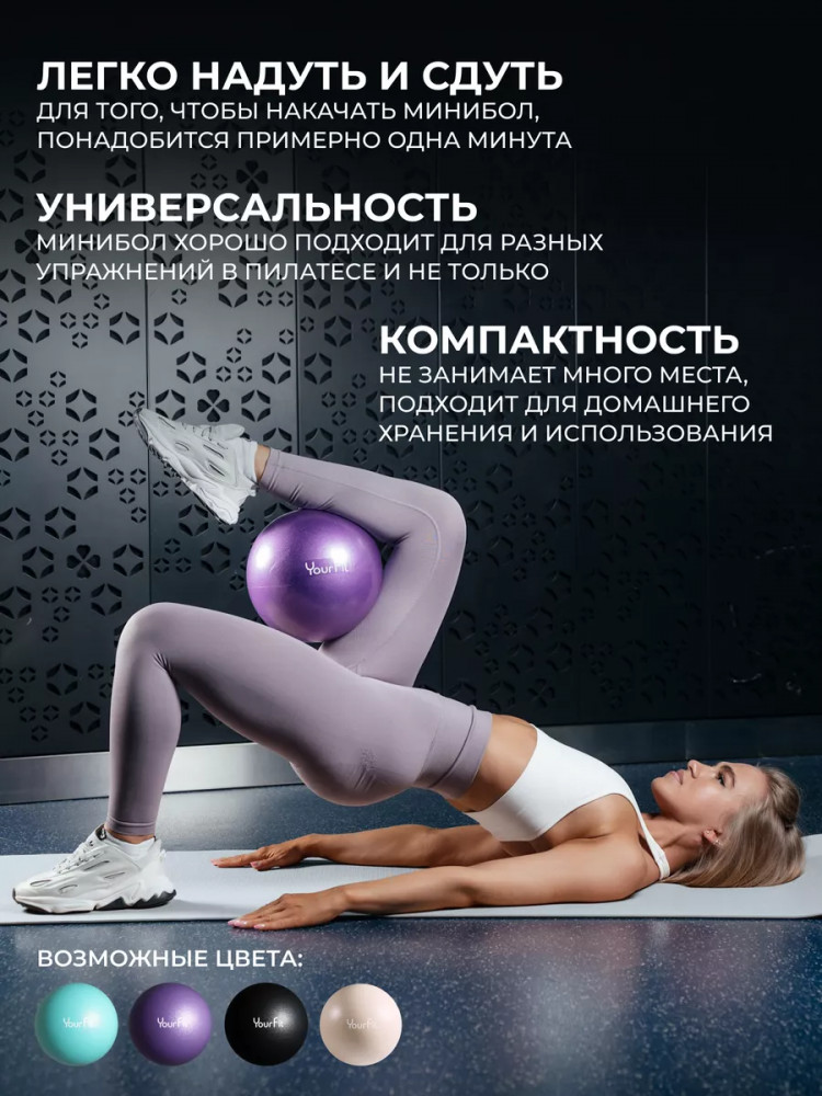 Мяч для пилатеса диаметром 25 см от YourFit — это идеальный выбор для тех, кто занимается пилатесом, йогой, художественной гимнастикой и функциональными тренировками. Этот универсальный фитбол способствует активизации всех мышц тела и вносит разнообразие в рутину тренировок. Он является отличной альтернативой традиционному спортивному оборудованию, предлагая новые возможности для укрепления бедер, кора и ягодиц. Благодаря своей прочности,шар для фитнеса, изготовленный из качественного PVC и способный выдержать нагрузку до 100 кг, обеспечивает безопасность и надежность во время занятий. С его помощью вы сможете укрепить мышцы корпуса, рук и ног, улучшить гибкость и координацию движений, избавиться от болей в шее и спине. Материал гипоаллергенен, а специальное покрытие гарантирует надежный захват.