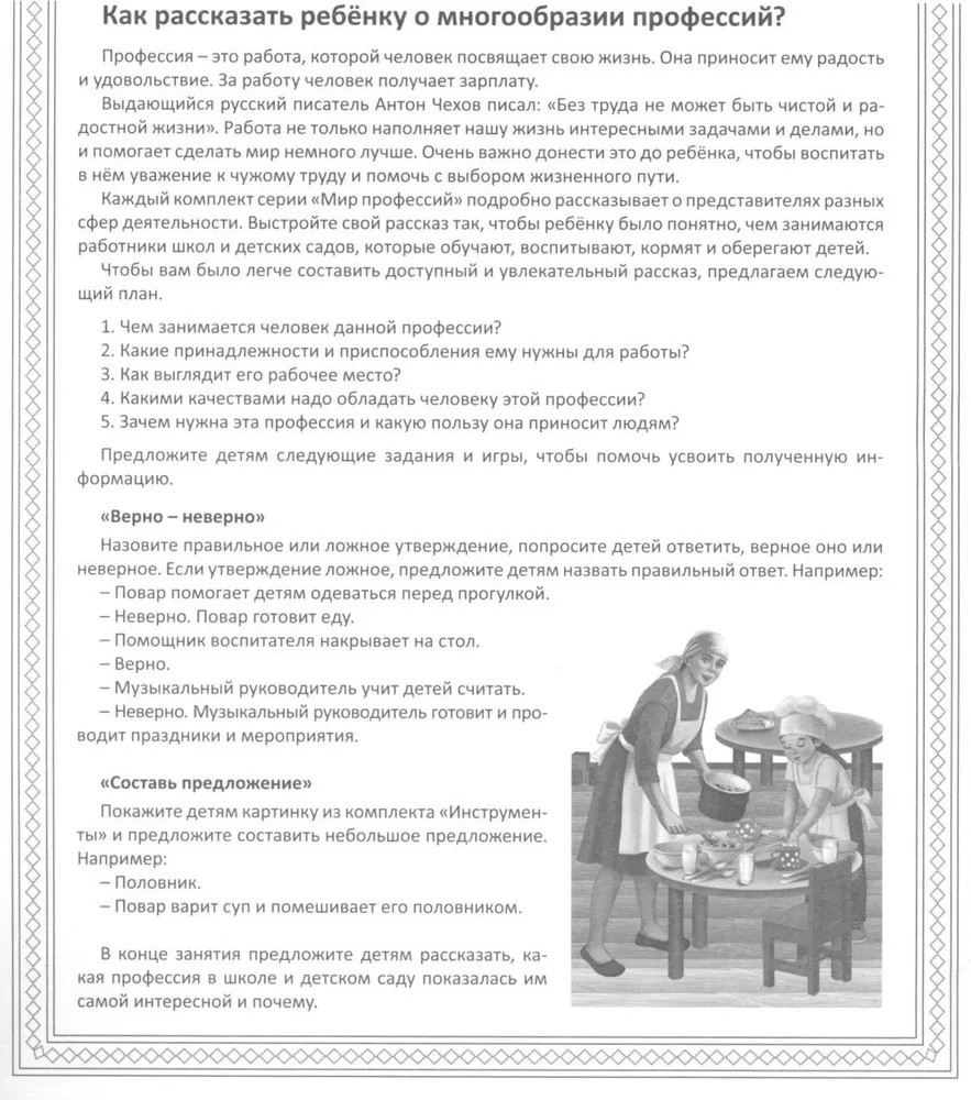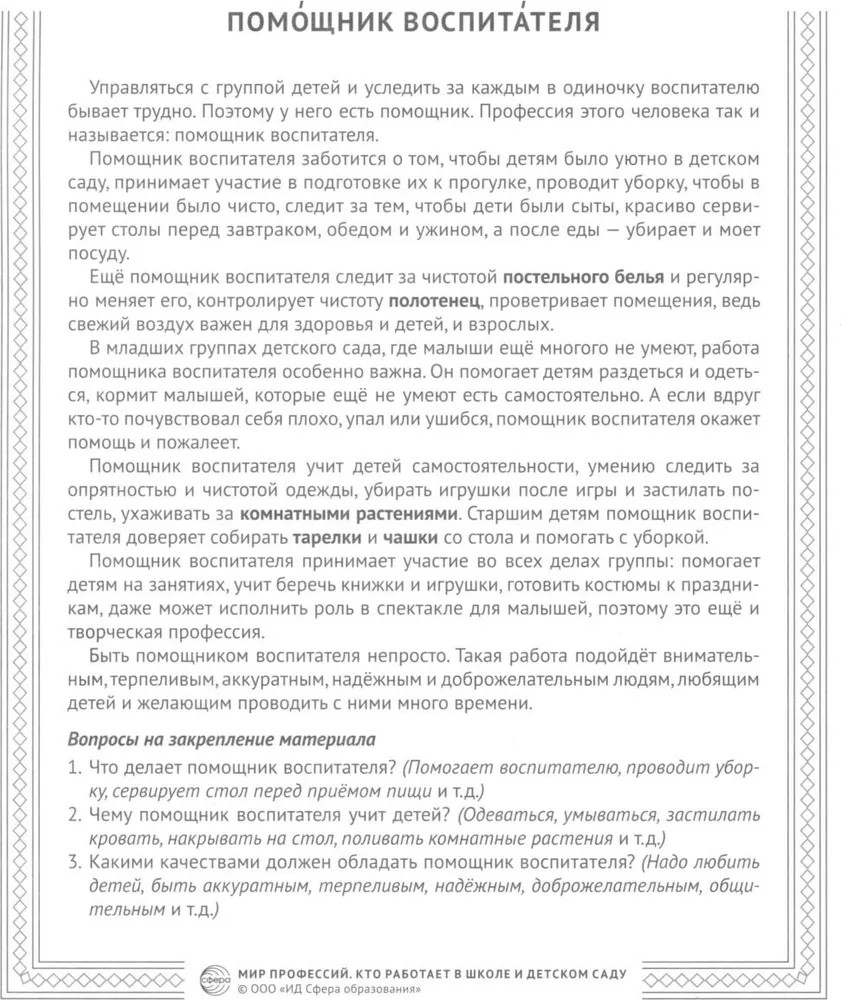 Серия: Мир профессий Комплект дидактических материалов «Кто работает в школе и детском саду» предназначен для детей дошкольного возраста и направлен на знакомство с профессиями, связанными с образовательными учреждениями. Включает в себя демонстрационные картинки и раскраски, которые помогут детям понять, кто заботится о их обучении и воспитании. Состав комплекта: Демонстрационные картинки «Мир профессий. Кто работает в школе и детском саду»: В папке представлены 12 ярких и наглядных картинок, изображающих различных специалистов, работающих в школе и детском саду, таких как учитель, воспитатель, психолог, медсестра и другие. Каждая картинка сопровождается 20 разрезными карточками, которые можно использовать для активного обучения и обсуждения. Дети смогут не только увидеть, но и узнать о профессиях, что способствует расширению их кругозора и развитию речевых навыков. |