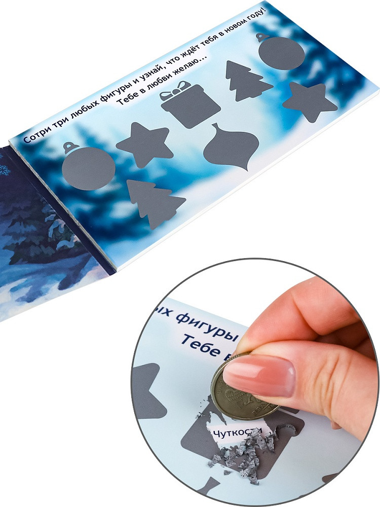 Набор из 12 ярких Новогодних открыток с предсказаниями со скретч-слоем — идеальный подарок для родных и близких, который принесет радость и восторг. Сотри три любых фигуры и узнай что ждёт тебя в Новом году! |