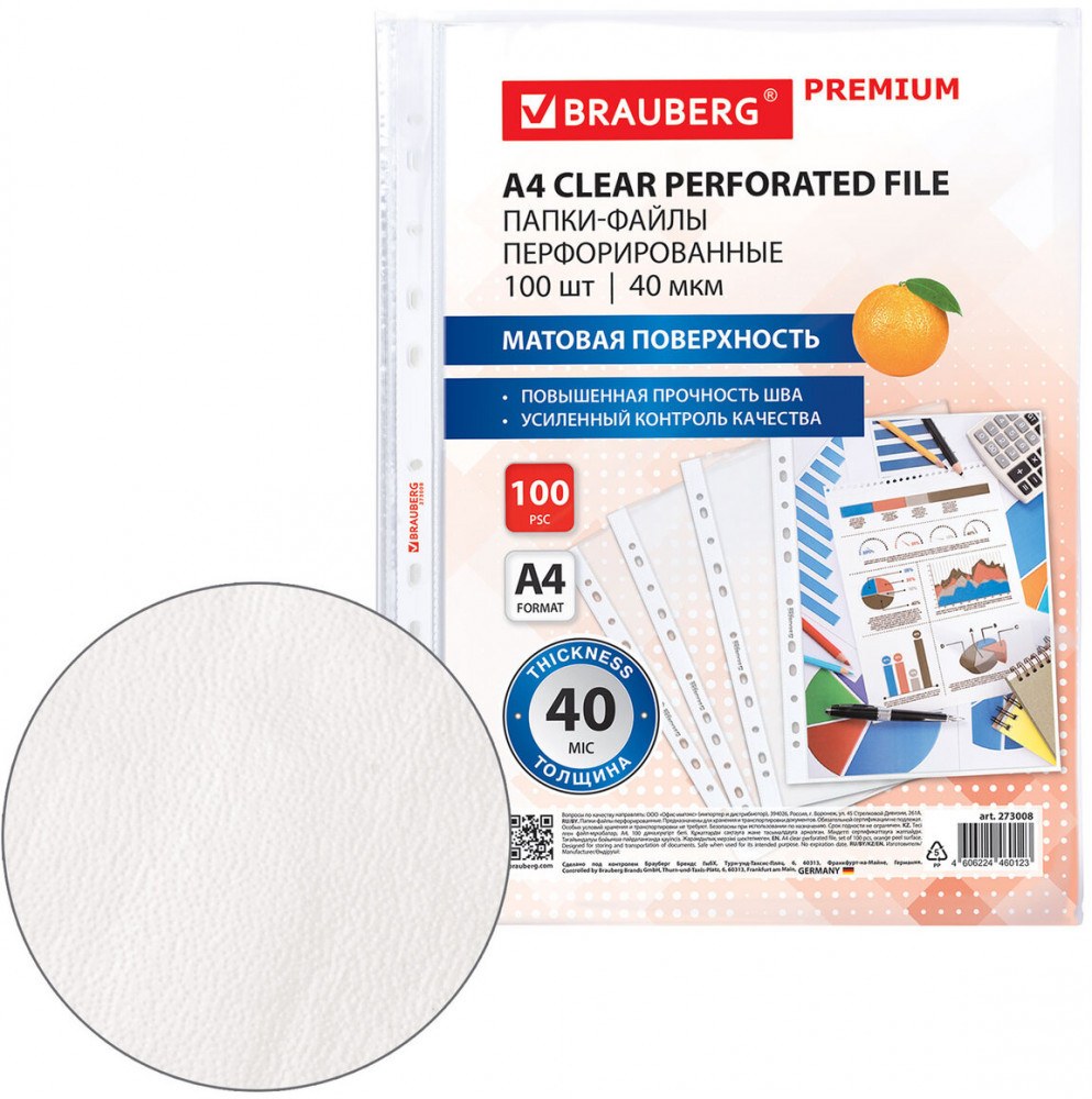 Серия: Premium Перфорированные папки-файлы Brauberg предназначены для хранения и защиты бумажных документов от загрязнения и механических повреждений. Перфопапки формата А4 с вертикальным размещением и универсальной перфорацией имеют матовую поверхность и прочные швы. Файлы являются незаменимым атрибутом в офисе, позволяют систематизировать документы и обеспечивают их сохранность на долгое время. Изготовлены из прочной пленки толщиной 40 мкм. В комплект входит 100 перфопапок. |