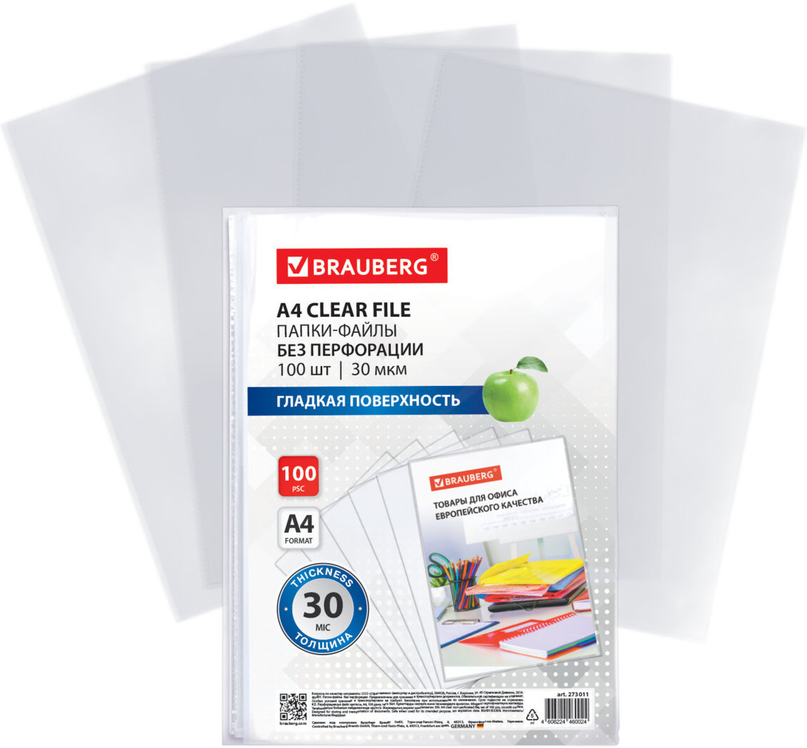 Папки-файлы без перфорации Brauberg предназначены для хранения и защиты бумажных документов от загрязнения и механических повреждений. Папки-файлы формата А4 без перфорации с вертикальным размещением имеют гладкую поверхность и прочные швы. Файлы являются незаменимым атрибутом в офисе, позволяют систематизировать документы и обеспечивают их сохранность на долгое время. Изготовлены из прочной пленки толщиной 30 мкм. В комплект входит 100 штук.