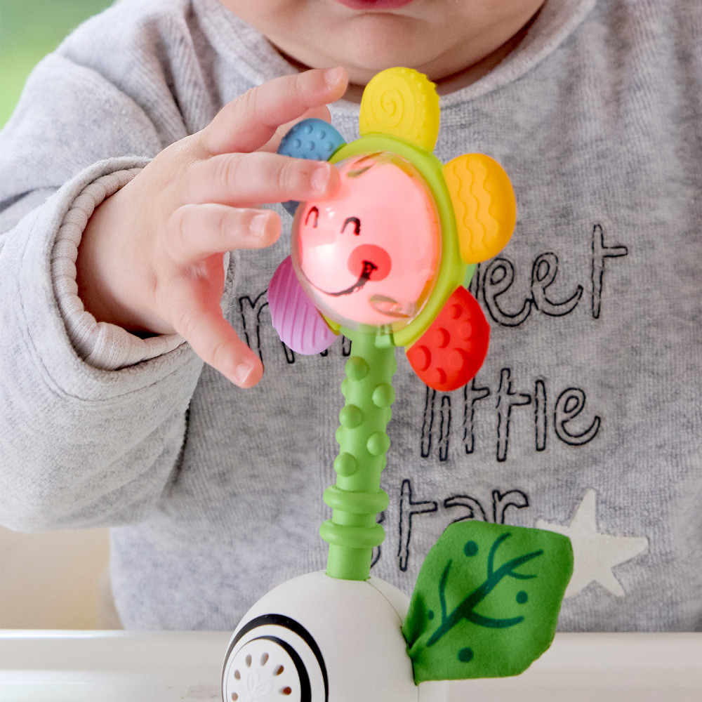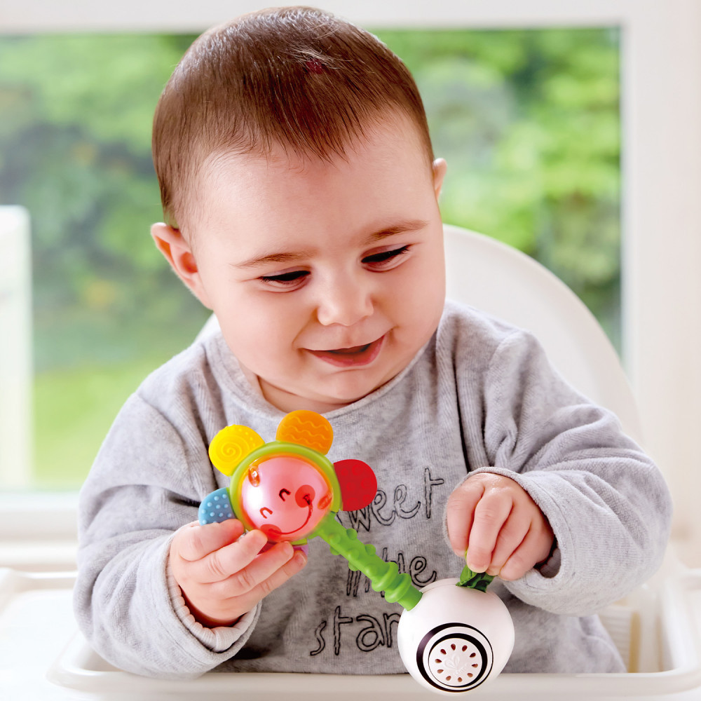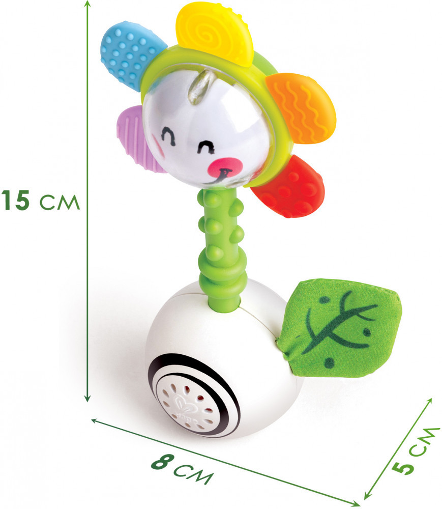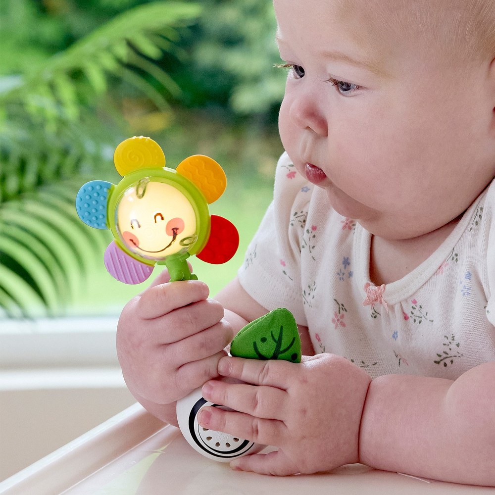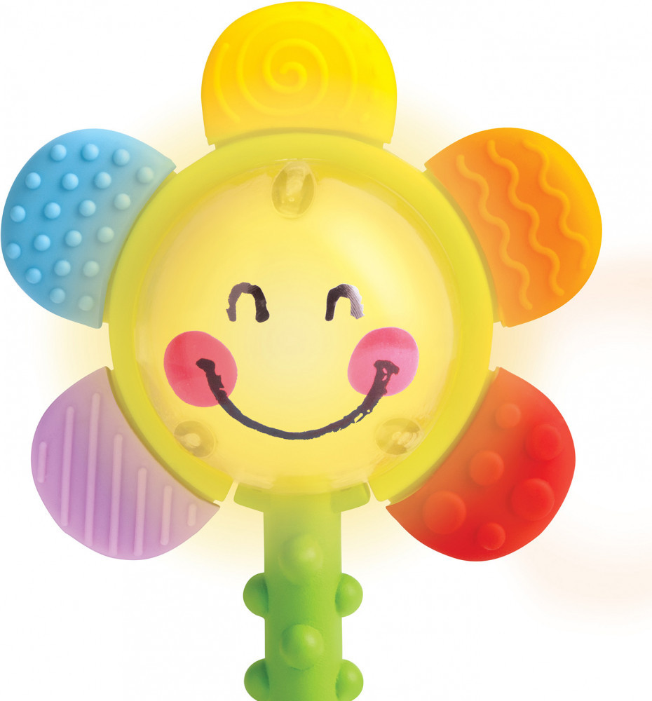 Комплектация: погремушка в виде цветочка (для работы подсветки нужны 3 батарейки LR44 — входят в комплект).