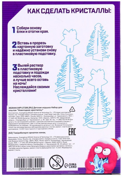 Эврики Набор для опытов «Опыты. Ёлочка. Чудесные кристаллы»новинка В данный момент этот товар отсутствует в продаже. Возможно, у нас найдется аналогичный или похожий товар здесь. Набор для выращивания волшебных кристаллов понравится юным любителям химических экспериментов. Как провести опыт. . Соберите основу фигурки и отогните края. Вставьте в прорезь картонную заготовку и надёжно установите фигурку в пластиковую подставку. Налейте раствор в пластиковую подставку и подождите несколько часов, а лучше оставьте на ночь. К утру ваши кристаллы вырастут. Что входит в набор: заготовка, пластиковая форма, жидкость для выращивания кристаллов, основа для кристаллов. Рекомендовано для детей от 4 лет. |