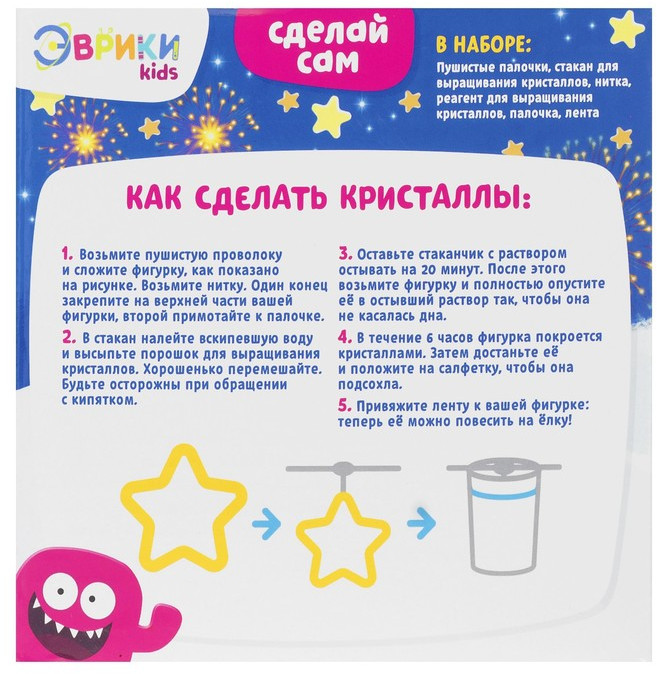 С набором «Звездочка» ребёнок увидит, как растут кристаллы! Этот процесс не просто интересен — он завораживает, а готовый результат станет настоящим украшением детской комнаты. Инструкции настолько просты и ясны, что справится даже 4-летний малыш. Не придётся долго ждать — за 6 часов кристаллы на фигурке уже вырастут. Все компоненты набора безопасны и абсолютно безвредны для детей. В коробке уже есть абсолютно всё, что понадобится для эксперимента. В результате опыта у ребёнка появится игрушка, покрытая кристаллами. Сделайте игрушку с помощью пушистой палочки. Налейте горячую воду в стакан. Высыпьте порошок для выращивания кристаллов. Перемешайте до полного растворения. Остудите раствор до комнатной температуры. Погрузите игрушку в жидкость. |