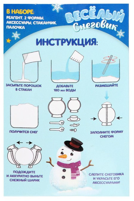 Создайте новогоднее волшебство без мороза! Набор «Весёлый снеговик» — это увлекательный эксперимент, который превращает обычный порошок в пушистую массу, похожую на настоящий снег. Дети от 4 лет смогут слепить своего снеговика даже в тёплой комнате. Настоящий снег дома: всего несколько простых действий — и порошок превращается в пластичную массу. Ребёнок сам создаст снежные шарики и соберёт из них снеговика. Безопасная химия для малышей: специальный состав нетоксичен, а процесс лепки не требует сложных инструментов. Всё, что нужно — вода и немного терпения. Развивающий праздничный эксперимент: набор знакомит с основами химии в игровой форме. Дети наблюдают, как вещества меняют свойства, и учатся проводить первые опыты. Готовый результат за 15 минут: снег становится плотным, как каучук, и держит форму. Снеговик не растает и станет украшением новогоднего стола. |