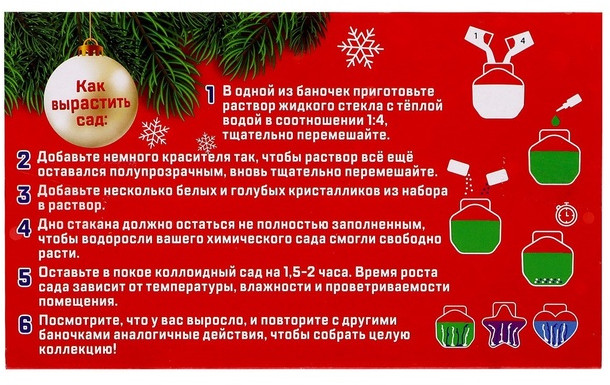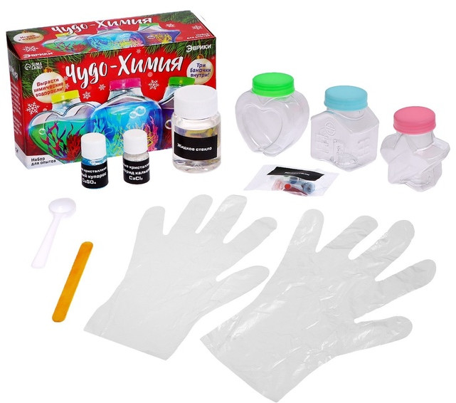 С набором для опытов «Эврики» ребёнок вырастит свой необычный сад. Творить чудеса могут не только Дед Мороз и Снегурочка, но и вы сами. Как вырастить чудо-сад. Приготовьте раствор силикатного клея с тёплой водой в соотношении 1:4, тщательно перемешайте. Добавьте немного красителя, чтобы раствор всё ещё оставался полупрозрачным, тщательно перемешайте. Добавьте несколько белых и голубых кристалликов в раствор. Дно стакана должно остаться не полностью заполненным. Оставьте в покое коллоидный сад на 1.5-2 часа. Результат: «растения» начнут подниматься вверх, создавая восхитительную картину. Подсказка: процесс роста можно снять на камеру в режиме таймлапс. Так вы получите ускоренное видео, показывающее, как растёт коллоидный сад. |