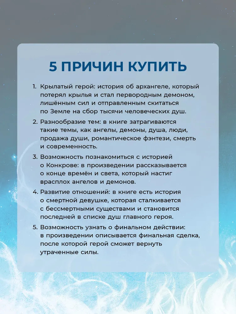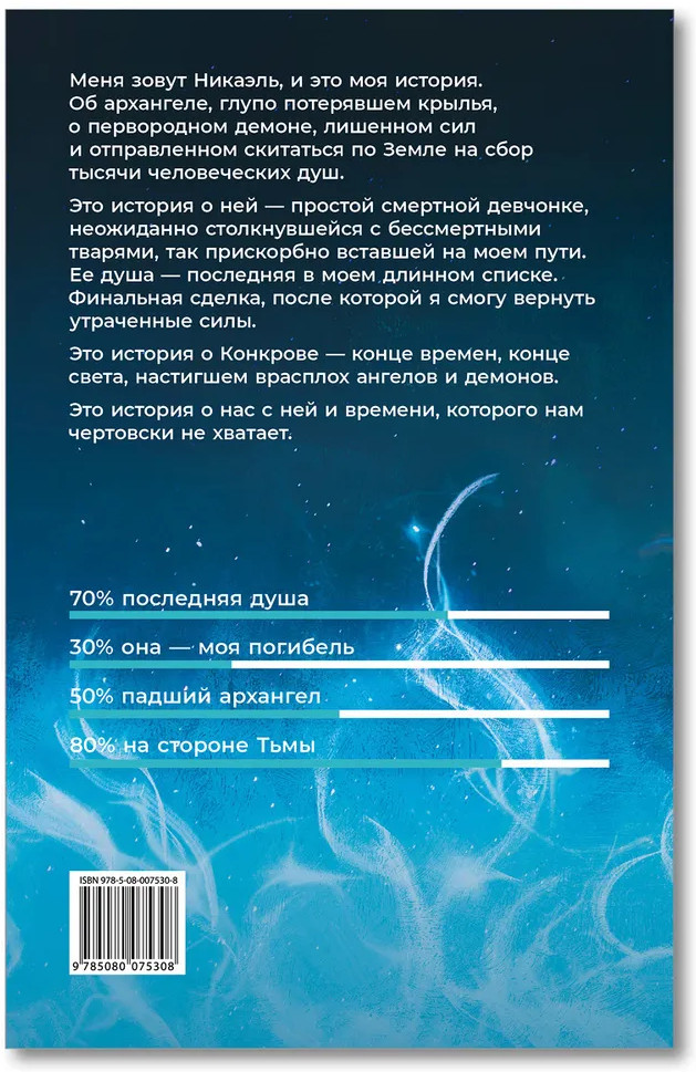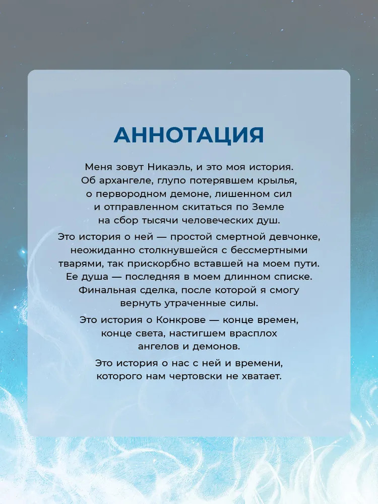 💳 Оплатить за товар можно при получении 🇰🇿 Есть бесплатная доставка по Казахстану от 1 дня 🎁 Копите бонусы с каждой покупки Меня зовут Никаэль — и это моя история. Об архангеле, глупо потерявшем крылья, о первородном демоне, лишенном сил и отправленном скитаться по Земле на сбор тысячи человеческих душ. Это история о ней — простой смертной девчонке, неожиданно столкнувшейся с бессмертными тварями, так прискорбно вставшей на моем пути. Ее душа — последняя в моем длинном списке. Финальная сделка, после которой я смогу вернуть утраченные силы. Это история о Конкрове — конце времен, конце света, настигшем врасплох ангелов и демонов. Это история о нас с ней и времени, которого нам чертовски не хватает. |