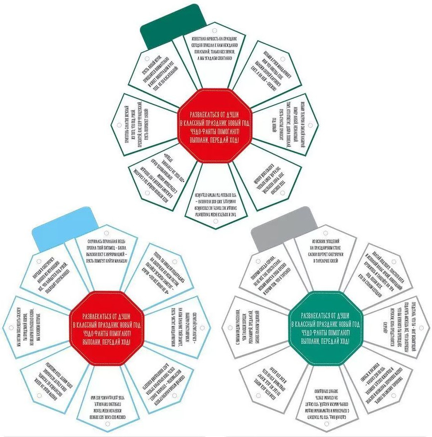 Набор новогодних фантов для веселого застолья. В упаковке 3 ромашки, в каждой — по 8 различных заданий для компании. Игра для приятного и веселого времяпрепровождения. Благодаря перфорации, лепестки с заданиями легко отрываются. Размер — 25×27 см. |