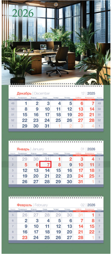 Квартальный календарь bg Mini premium на 2026 год — отличный инструмент для планирования в офисе и дома. Размер календаря — 195×475 мм. Ориентация — вертикальная. Календарь состоит из трёх блоков по 12 листов, закреплённых на трёх гребнях. Изготовлен из белой мелованной бумаги плотностью 90 г/м² с двухцветной печатью. Подложка изготовлена из чистоцеллюлозного мелованного картона 290 г/м2, печать — полноцветная. Бегунок-курсор помогает легко ориентироваться по датам, а пикколо позволяет удобно разместить календарь на стене.
