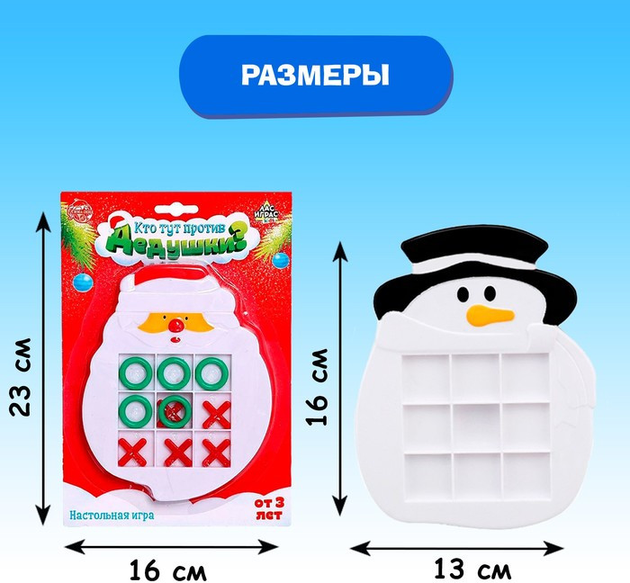 «Кто тут против дедушки?» — стратегическая настольная игра крестики-нолики в новогодней оформлении для детей от 3 лет. Ребёнку предстоит составить цепочку из трёх одинаковых символов быстрее противника. Ход игры. Определитесь с фигурками: один игрок выбирает крестики, а другой нолики. По очереди ставьте на свободные клетки поля фигурки. Победит тот, кто первый соберёт ряд из 3 одинаковых символов по диагонали, горизонтали или вертикали. Увлекательно и полезно. Занимательная и простая в исполнении настолка завоюет внимание с первых минут. Малыш разовьёт интеллект, прокачает моторику и научится строить логические заключения. |