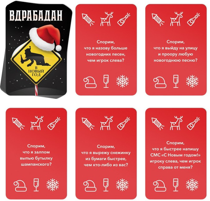 Спорим, эта игра поможет классно встретить Новый год? Азарт, веселье, задания, связанные с алкоголем. Ведь именно поэтому вы и собрались сегодня! Делайте ставки, выполняйте задания и получите массу позитива! Состав:50 карт20 жетонов, правила игры. Играйте и встречайте Новый год вместе с Лас Играс! |