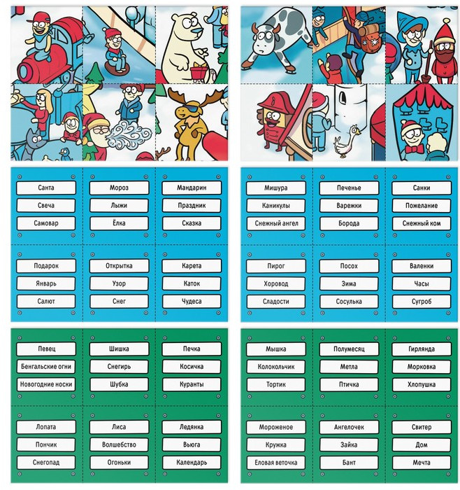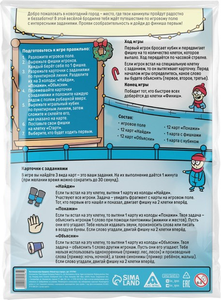Добро пожаловать в новогодний город — место, где твои каникулы пройдут радостно и беззаботно! В этой весёлой бродилке тебя ждёт путешествие по игровому полю с интересными заданиями. Прояви сообразительность и дойти до финиша первым! Ход игры: первый игрок бросает кубик и передвигает фишку на то количество клеток, которое выпало. Ход передаётся по часовой стрелке. Если игрок встал на специальную клетку с заданием, то он вытягивает карточку. Перед началом игры определитесь, какое слово вы будете объяснять (первое, второе, третье).Конец игры: победит тот, кто быстрее всех доберется до клетки «Финиш». Состав: игровое поле12 карт «Найди» 12 карт «Объясни» 12 карт «Покажи» 1 карта с фишками1 карта с кубиком. Играйте и встречайте Новый год вместе с Лас Играс! |