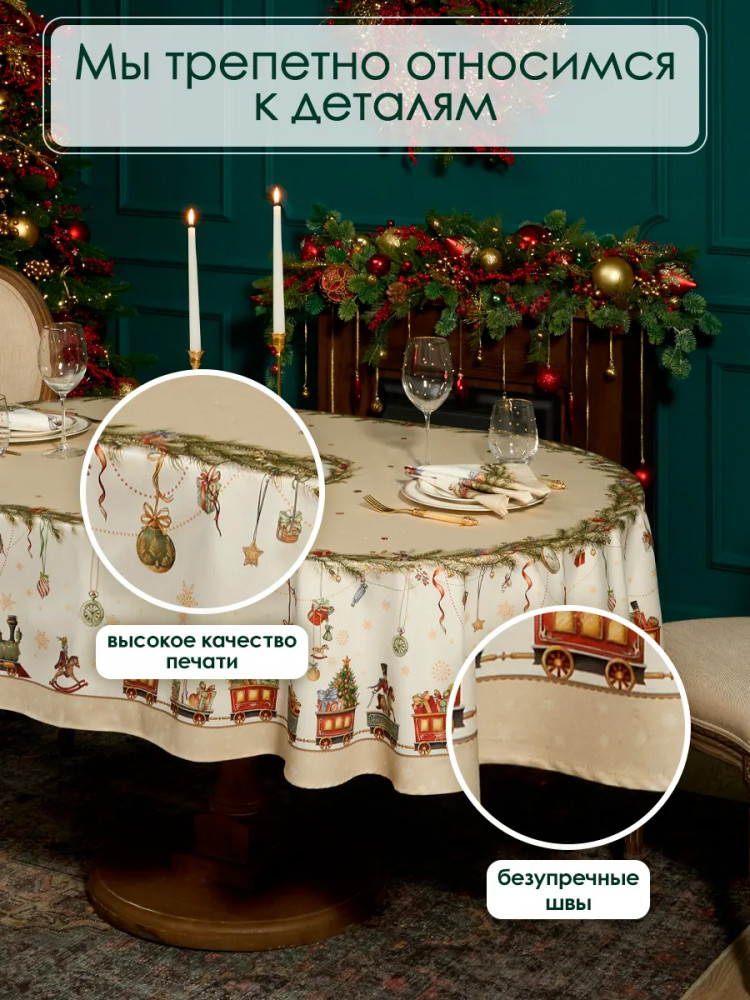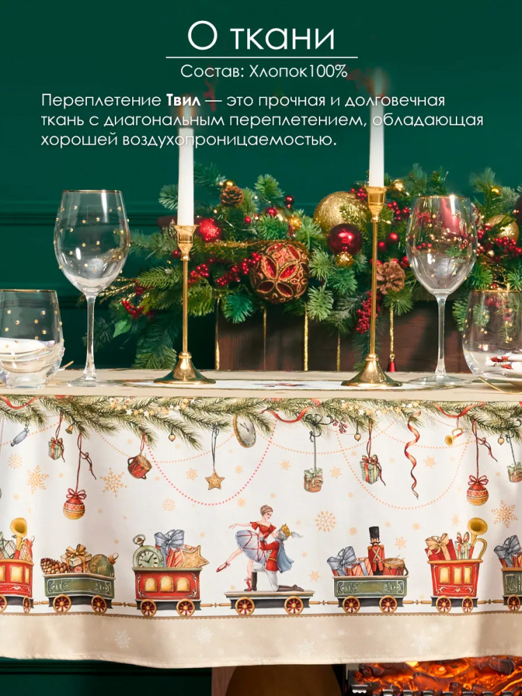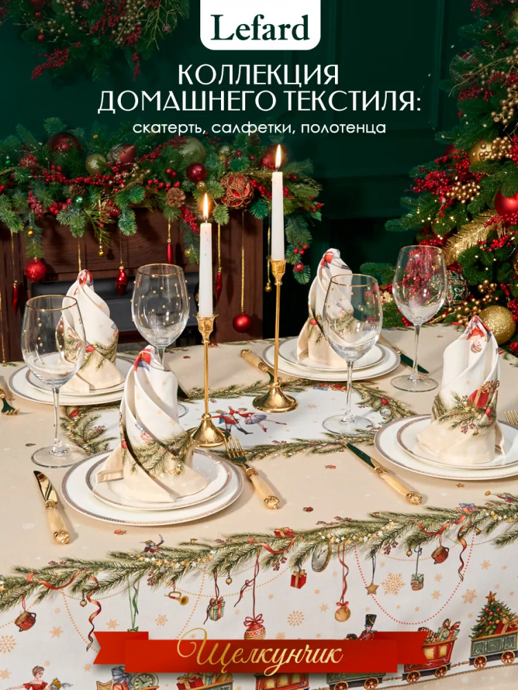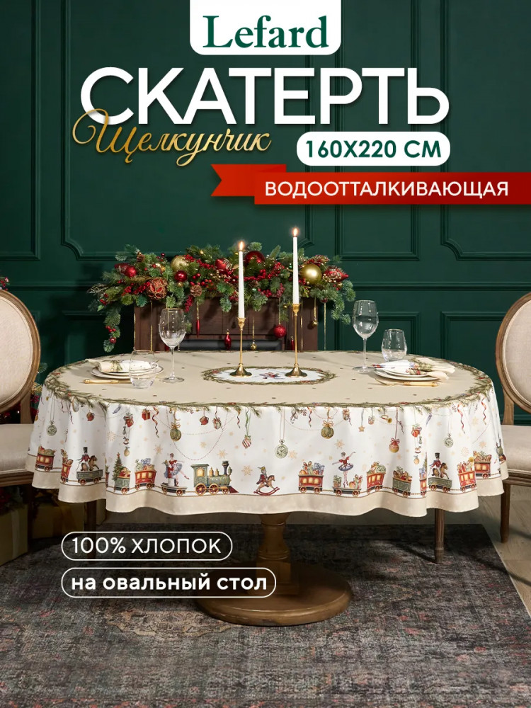 Овальная скатерть создана производителем Lefard по эксклюзивному дизайну для серии посуды «Щелкунчик» бренда Lefard. Прекрасно подойдет для любого стола. Изготовлена из плотного хлопкового текстиля с пропиткой, за счёт которой с неё легко убрать пролитую жидкость. Плотность ткани составляет 190 г\м2, она имеет приятную структуру и называется твил. Состав ткани 100% хлопок с водоотталкивающей пропиткой. Наша водонепроницаемая скатерть легка в уходе, она не впитывает мгновенно жидкость на обеденном столе и избавит вас от хлопот с отстированием пятен после застолья. Ее можно стирать и при этом она не теряет свою текстуру и цвет даже после многих стирок. Главными преимуществами твила являются износостойкость, плотность и лёгкий красивый блеск. Эта ткань не заламывается и не сильно мнется. Скатерть из твила выглядит аккуратно и элегантно. Такая скатерть станет отличным дополнением к интерьеру вашей кухни.