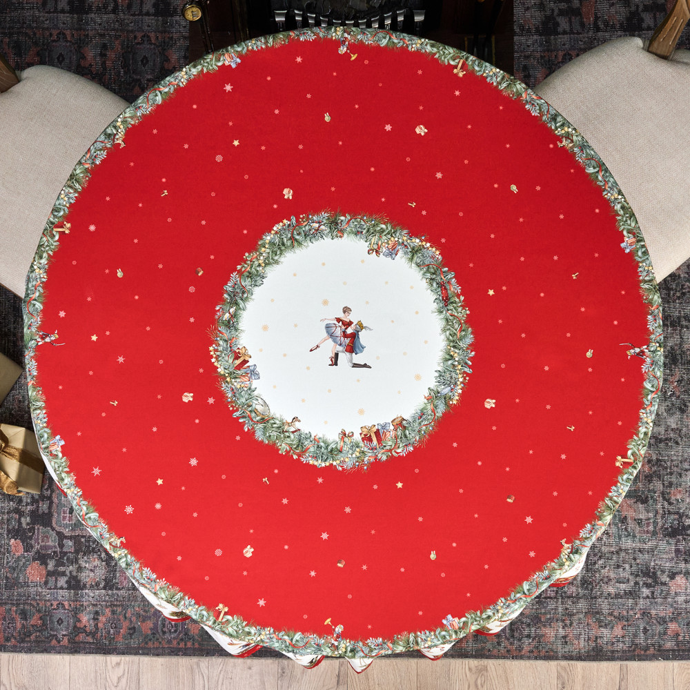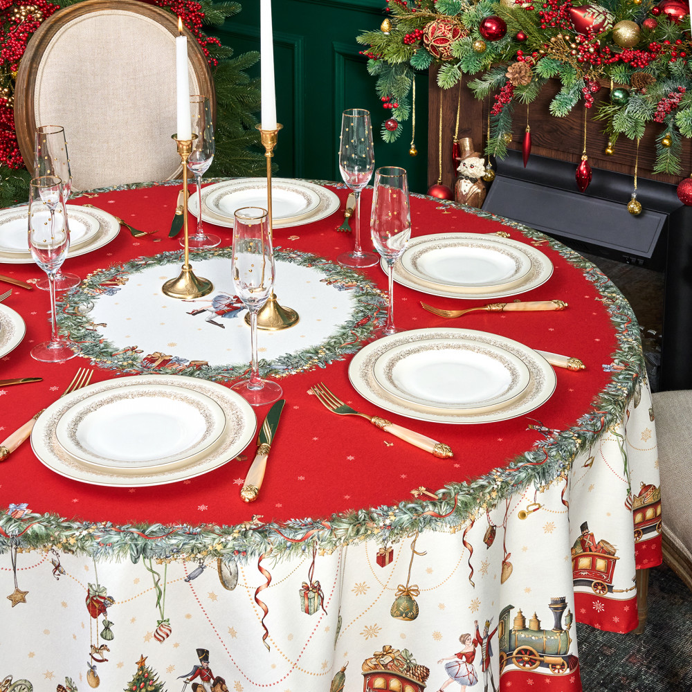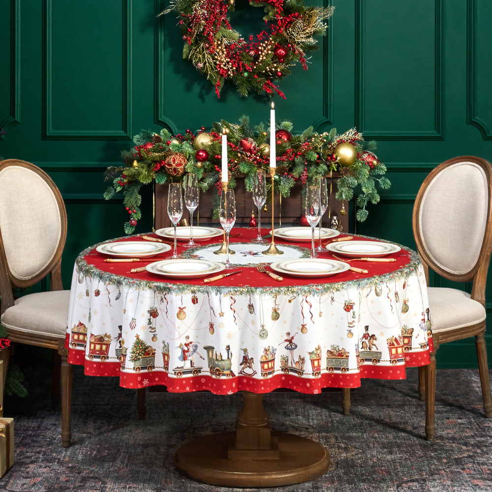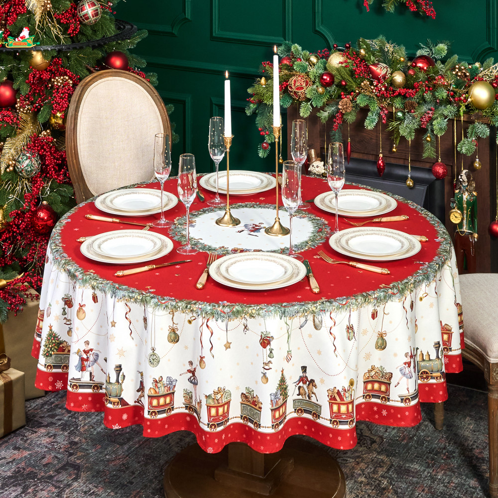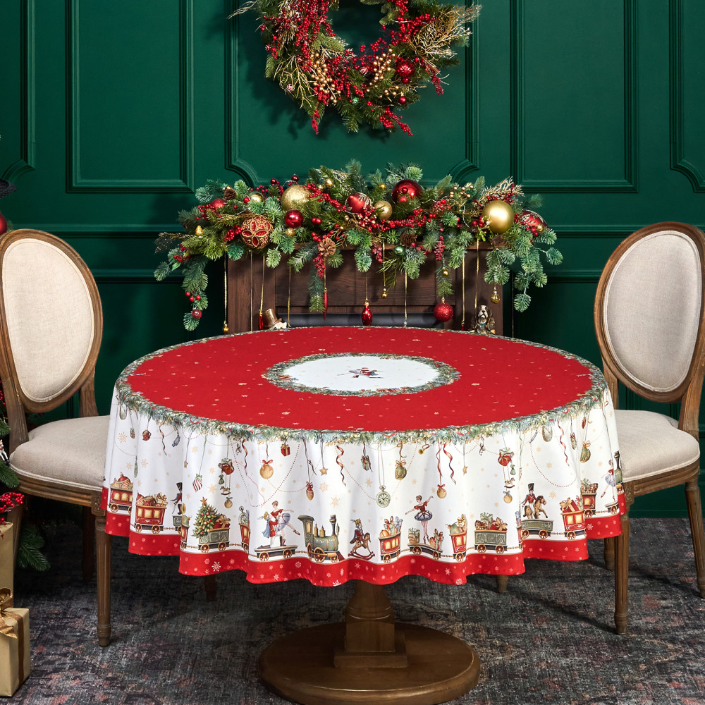 Скатерть от Lefard из коллекции «Щелкунчик» — элегантное решение для сервировки праздничного стола. Диаметр скатерти — 190 см, она подходит для круглых столов диаметром от 100, 110,120, 130 см, обеспечивая эстетичный свес 20–45 см в зависимости от размера столешницы. Выполнена из 100% хлопка (твил) плотностью 190 г/м². Прочная саржевая структура делает ткань износостойкой, устойчива к сминанию и сохраняет форму даже при многократном использовании. Благодаря водоотталкивающей пропитке поверхность защищена от влаги и легко очищается, что делает её практичным выбором для праздничных застолий.