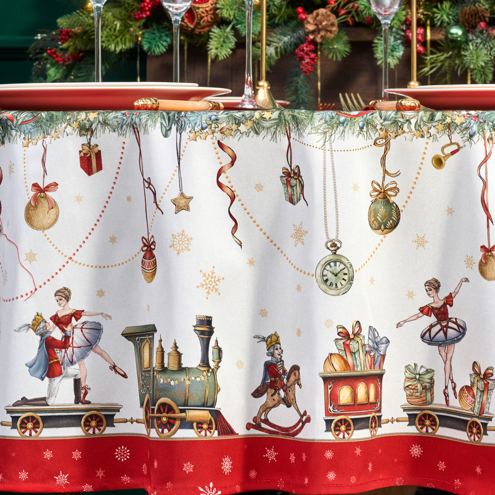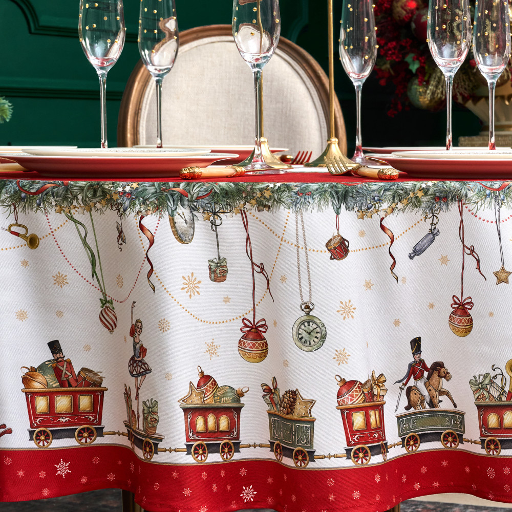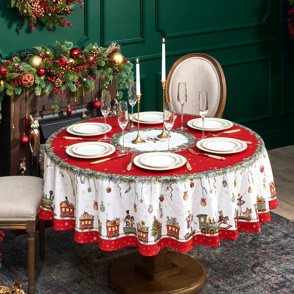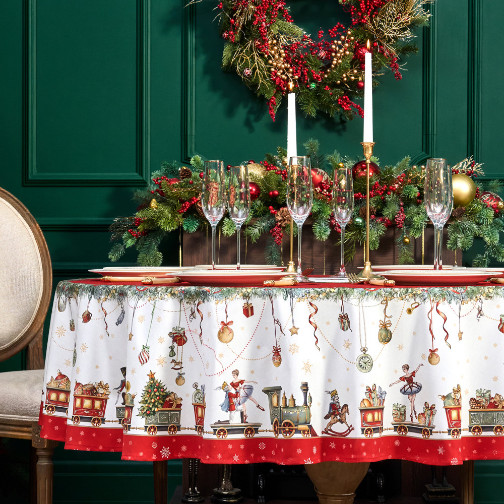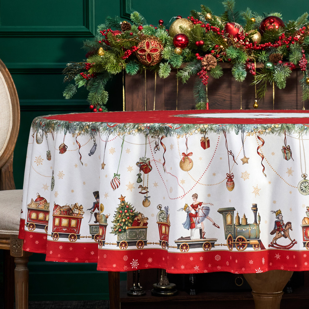 Скатерть от Lefard из коллекции «Щелкунчик» — элегантное решение для сервировки праздничного стола. Диаметр скатерти — 190 см, она подходит для круглых столов диаметром от 100, 110,120, 130 см, обеспечивая эстетичный свес 20–45 см в зависимости от размера столешницы. Выполнена из 100% хлопка (твил) плотностью 190 г/м². Прочная саржевая структура делает ткань износостойкой, устойчива к сминанию и сохраняет форму даже при многократном использовании. Благодаря водоотталкивающей пропитке поверхность защищена от влаги и легко очищается, что делает её практичным выбором для праздничных застолий.