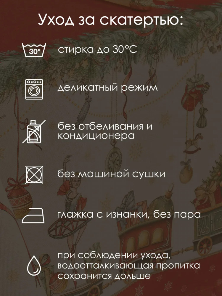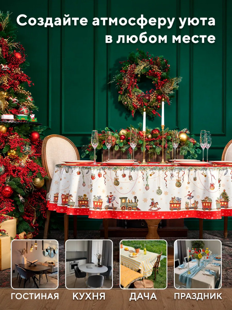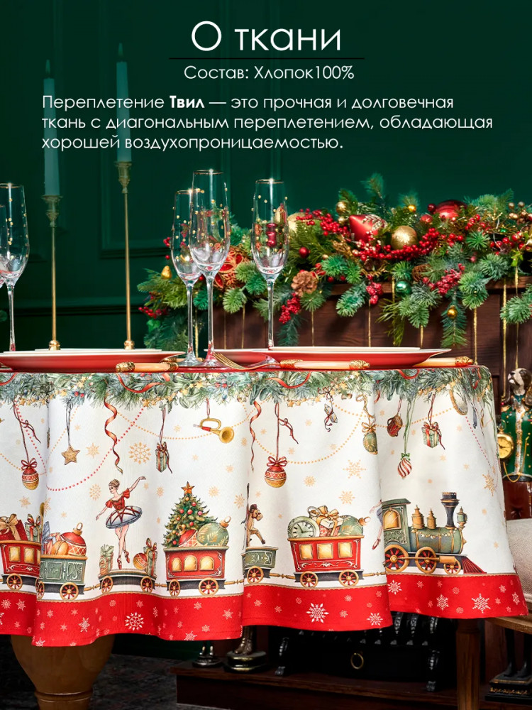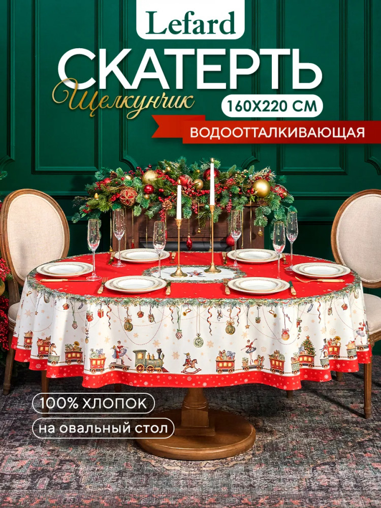 Овальная скатерть создана производителем Lefard по эксклюзивному дизайну для серии посуды «Щелкунчик» бренда Lefard. Прекрасно подойдет для любого стола. Изготовлена из плотного хлопкового текстиля с пропиткой, за счёт которой с неё легко убрать пролитую жидкость. Плотность ткани составляет 190 г\м2, она имеет приятную структуру и называется твил. Состав ткани 100% хлопок с водоотталкивающей пропиткой. Наша водонепроницаемая скатерть легка в уходе, она не впитывает мгновенно жидкость на обеденном столе и избавит вас от хлопот с отстированием пятен после застолья. Ее можно стирать и при этом она не теряет свою текстуру и цвет даже после многих стирок. Главными преимуществами твила являются износостойкость, плотность и лёгкий красивый блеск. Эта ткань не заламывается и не сильно мнется. Скатерть из твила выглядит аккуратно и элегантно. Такая скатерть станет отличным дополнением к интерьеру вашей кухни.