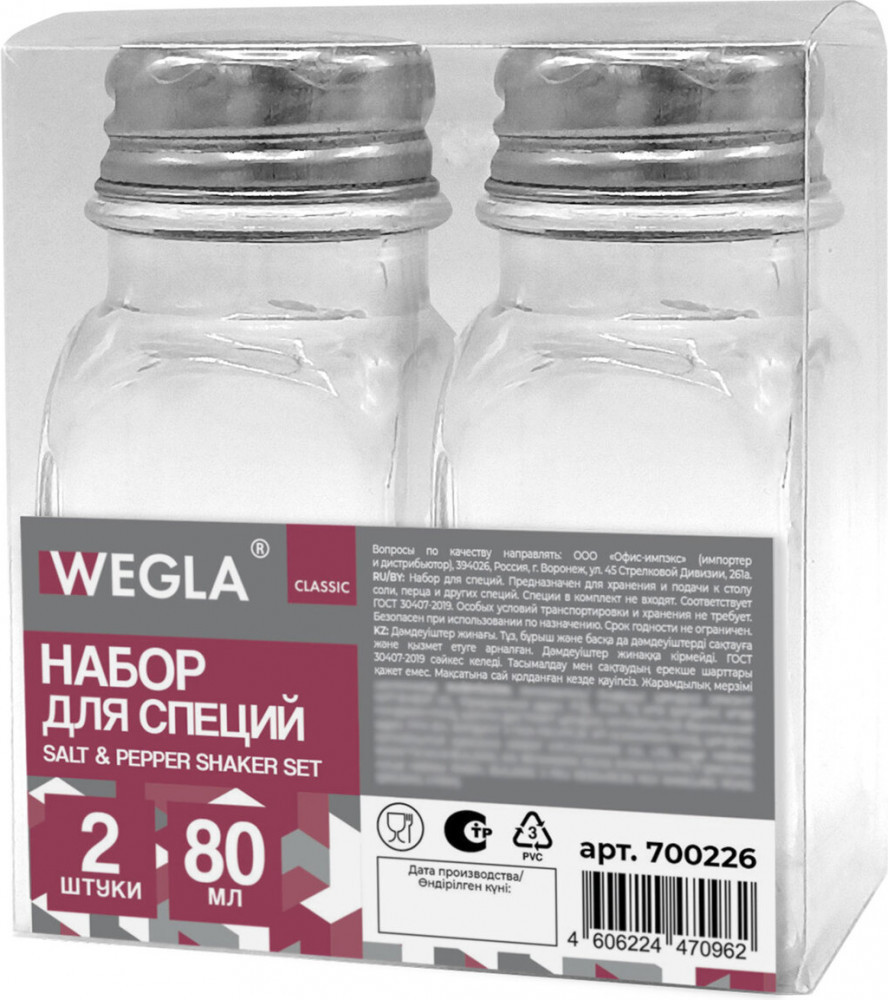 Набор для специй Wegla представляет собой набор из двух солонок-перечниц, предназначенный для удобного хранения и дозированной подачи сыпучих продуктов, таких как соль, перец или иные специи, а также для сервировки стола. Размер одной солонки составляет 9,5×4х4 см.