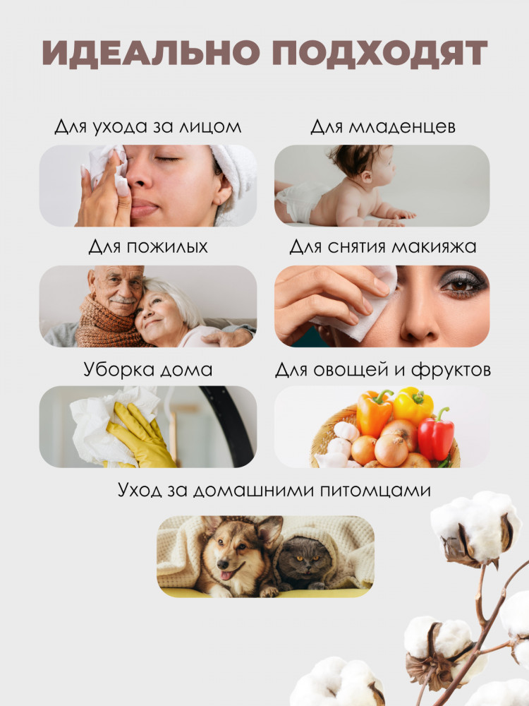 Салфетки — это не просто товары для красоты, это удобство и чистота каждый день. Косметические процедуры, снятие макияжа, уход за новорожденными, очищение лица и тела — всё это возможно с нашими полотенцами. Надёжная альтернатива бумажные изделиям, идеально подходят и для косметических целей, и для бытового применения. Используются в салонах, дома, на работе и в поездках.