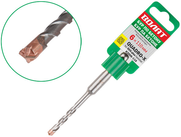 Волат Бур по бетону для перфораторов Quadro-Xновинка В данный момент этот товар отсутствует в продаже. Возможно, у нас найдется аналогичный или похожий товар здесь. Бур (сверло) для сверления отверстий в бетоне, кирпичной кладке, камне, граните. Двойной крестообразный наконечник облегчает процесс сверления и образует более ровное (правильной формы) отверстие в обрабатываемом материале.  |