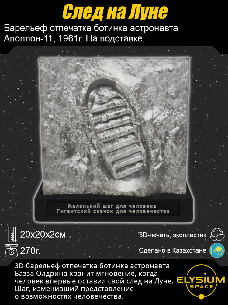 Барельеф с легендарным отпечатком ботинка астронавта миссии Apollo 11, сделанный в июле 1969 года на поверхности Моря Спокойствия. Этот след — не просто вдавленный грунт, а символ первого шага человечества за пределы Земли. Каждая деталь рельефа воссоздаёт структуру лунного реголита и форму подошвы космического скафандра A7L — того самого, в котором Базз Олдрин ступил на Луну вслед за Нилом Армстронгом. |