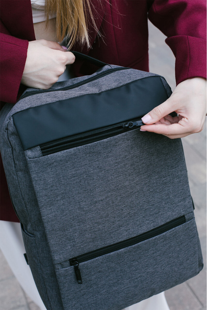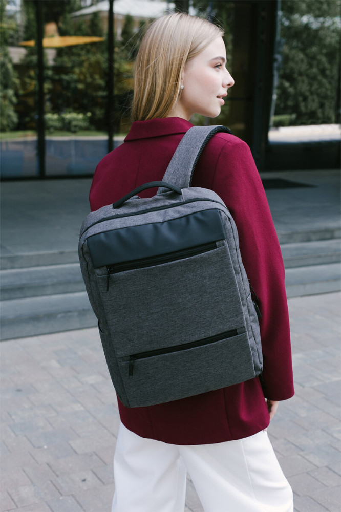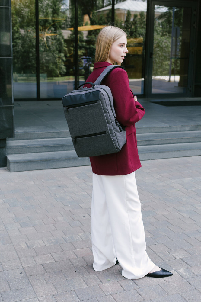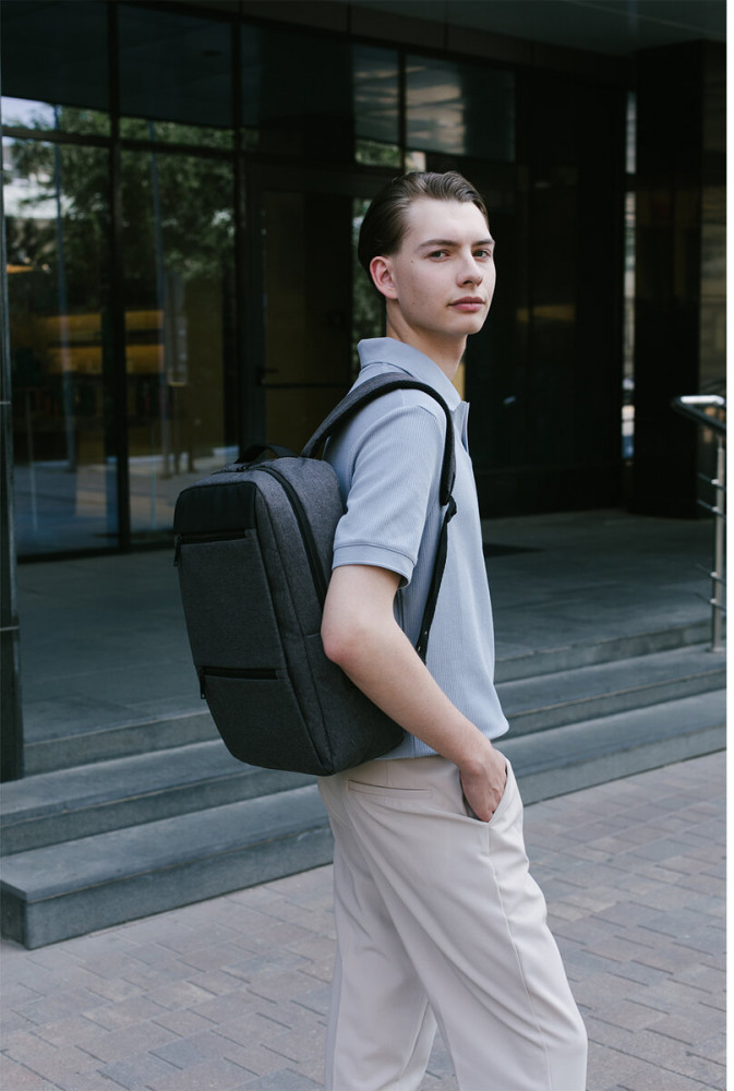 Модель выполнена из прочного полиэстера и дополнена вставкой из водонепроницаемого материала, защищающего от дождя и влаги. Компактные размеры (44×30×13 см), объём 15 литров и вес 570 г делают рюкзак лёгким и вместительным одновременно. Внутри предусмотрены пять карманов: карман для ноутбука до 16 дюймов, органайзер для мелочей, два внешних кармана на молнии и боковой для бутылки или зонта. Удобный доступ к содержимому обеспечивают надёжные двухсторонние молнии с крупными брендированными бегунками.