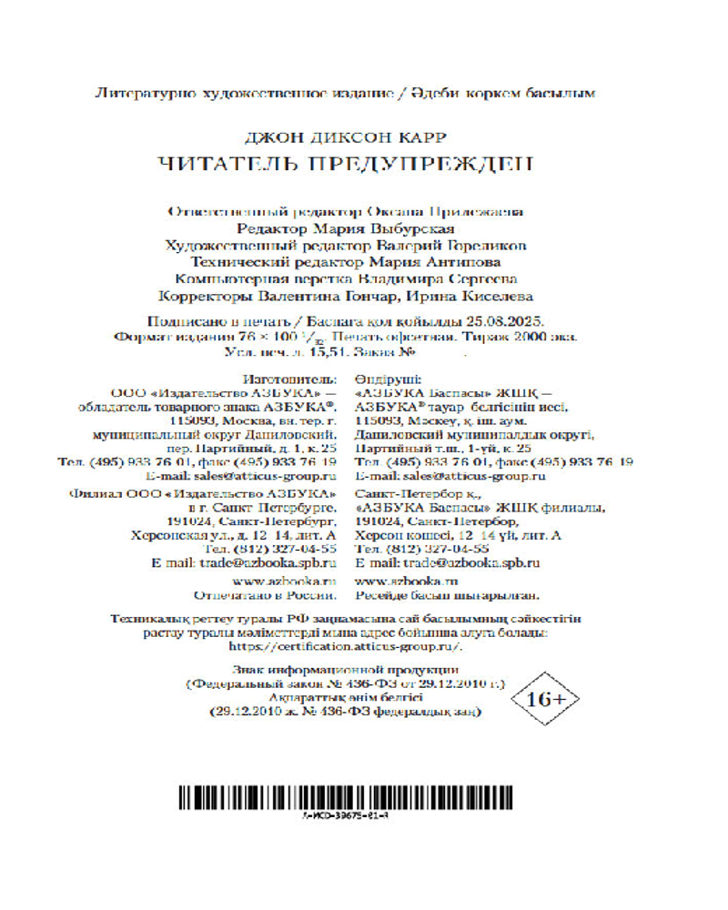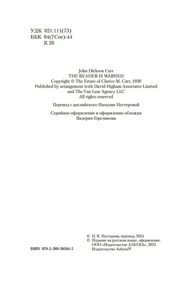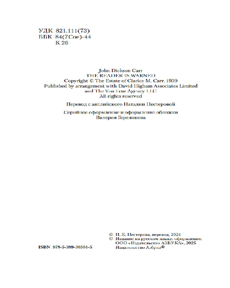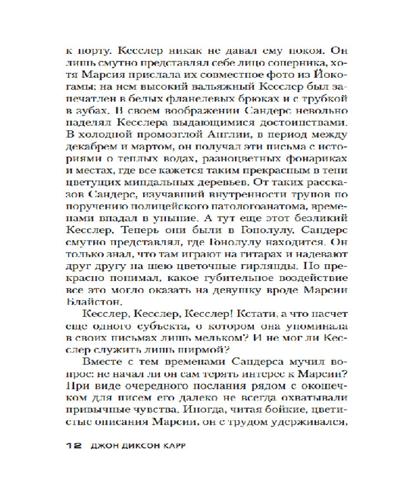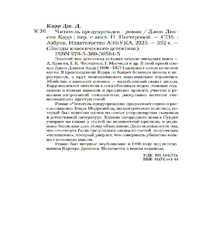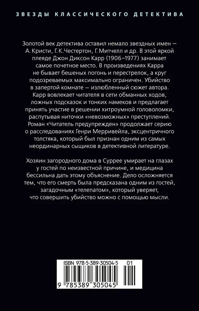 Серия: Звезды классического детектива (мягкая обложка) Золотой век детектива оставил немало звездных имен — А. Кристи, Г. К. Честертон, Г. Митчелл и др. В этой яркой плеяде Джон Диксон Карр (1906–1977) занимает самое почетное место. В произведениях Карра не бывает бешеных погонь и перестрелок, а круг подозреваемых максимально ограничен. Убийство в запертой комнате — излюбленный сюжет автора. Карр вовлекает читателя в сети обманных ходов, ложных подсказок и тонких намеков и предлагает принять участие в решении хитроумной головоломки, распутывая ниточки «невозможных» преступлений. |