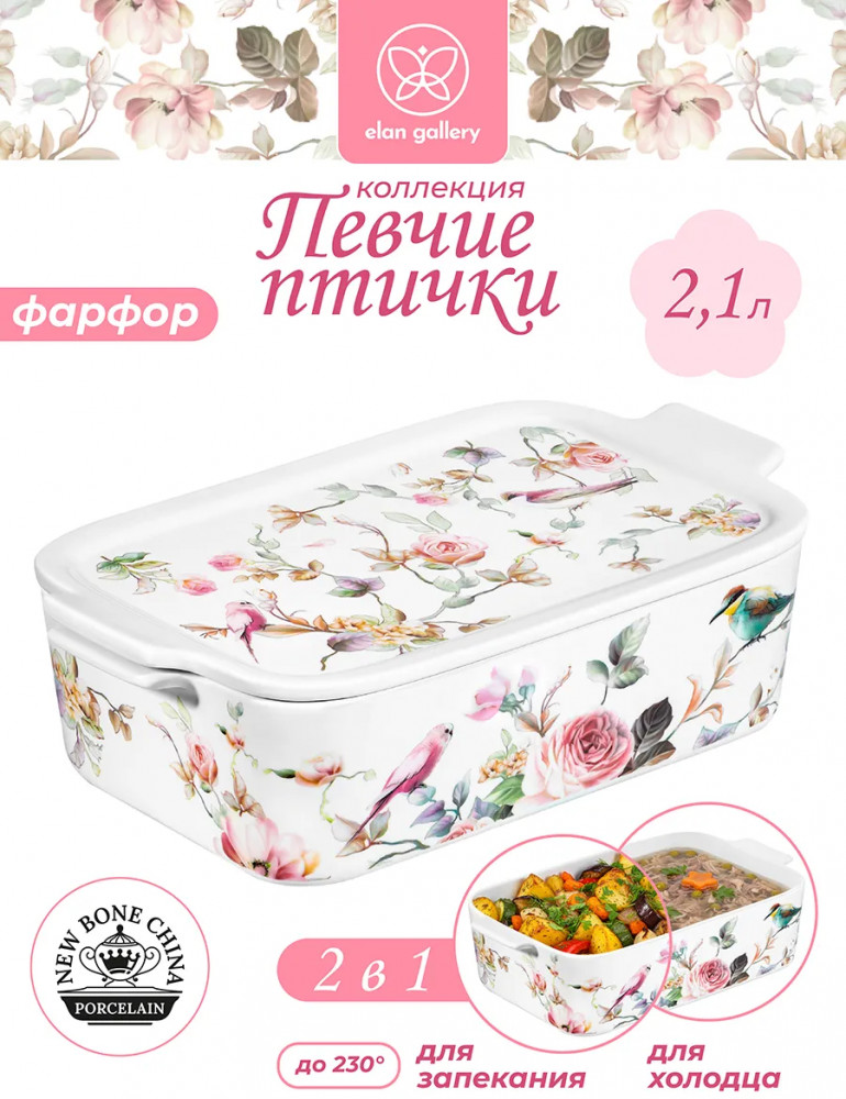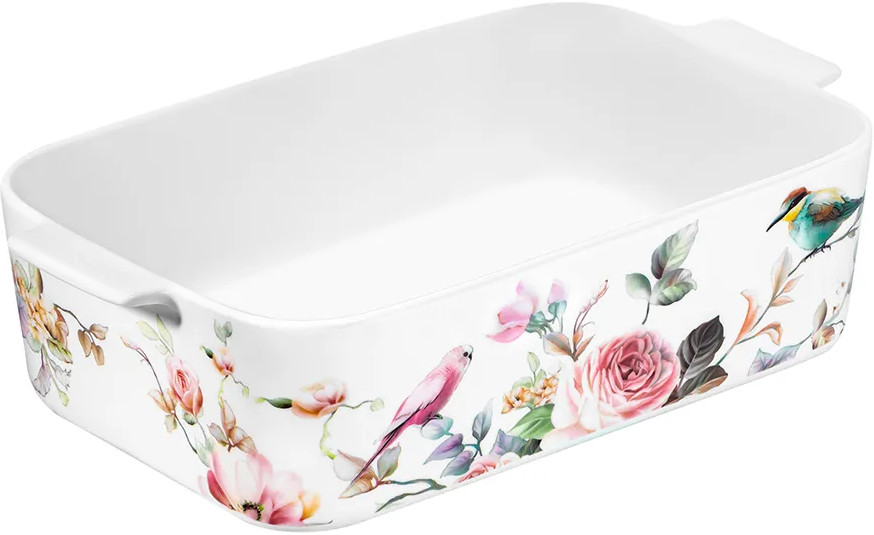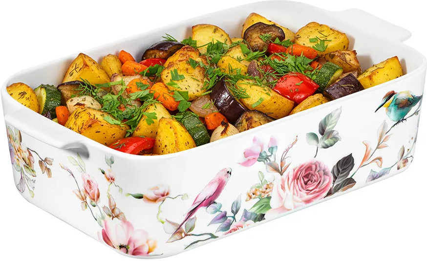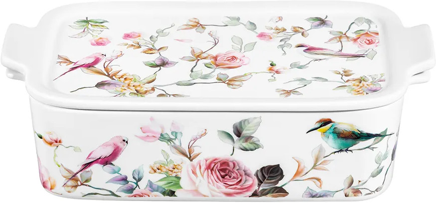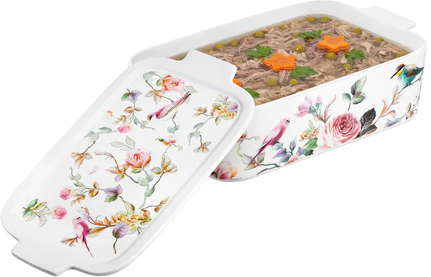 Блюдо для запекания из серии «Певчие птички» от Elan Gallery предназначено для приготовления и сервировки ваших любимых блюд. Размер ёмкости с крышкой — 29.5×18×8.5 см, без крышки — 29×17.5×7.5 см. Объём — 2.1 литра. Изготовлено из фарфора нового поколения new bone china, сочетающего в себе изящность и высокую прочность. За счёт гладкости изделие легко отмывается, поэтому сохраняет привлекательный внешний вид и практично в использовании. Плотная структура материала позволяет дольше сохранять температуру готовых блюд. От костяного фарфора new bone china отличается большей экологичностью в производстве. Изделие украшено рисунком пёстрых птичек и пышных бутонов роз. Они выполнены в манере, вдохновлённой акварельным рисунком. Глубокое прямоугольное блюдо удобно для приготовления разнообразных кулинарных шедевров: мясных и овощных запеканок, а также пирогов и заливного. Испеките нежный десерт из творога, приготовьте чизкейк, кекс или бисквит. Фарфоровая крышка поможет вам как в приготовлении, так и в хранении уже готовых блюд. Она способствует равномерному распределению тепла и предотвращает высыхание, сохраняя сочность и нежность ингредиентов. Накройте крышкой готовое блюдо, чтобы защитить его от грязи и пыли или надёжно хранить в холодильнике. Удобные ручки позволят вам легко снимать и надевать крышку, а изогнутые ручки на корпусе облегчат переноску даже заполненной ёмкости.