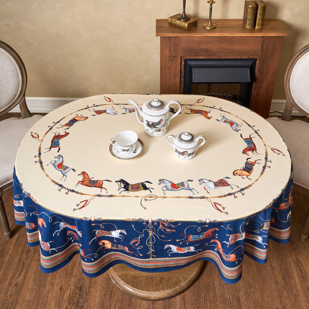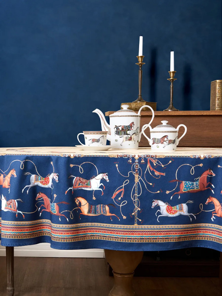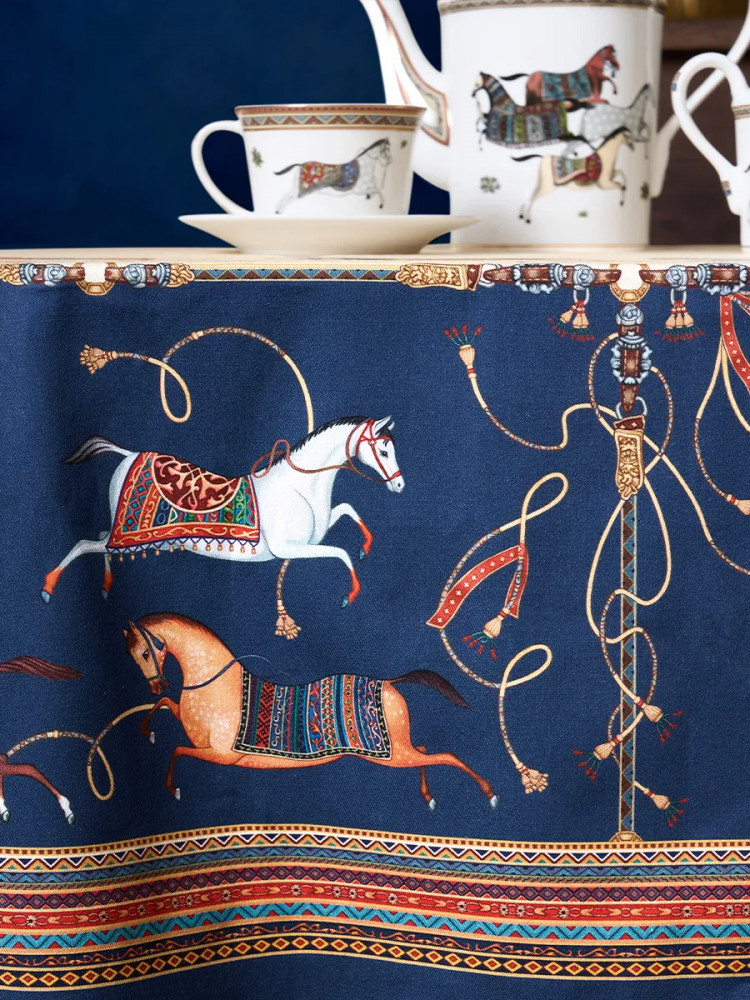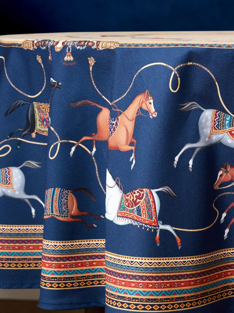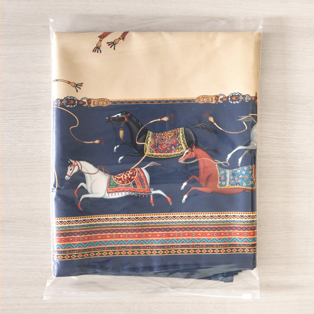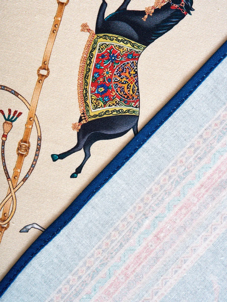 Благородный тёмно-синий фон украшен орнаментом с грациозными лошадьми, создавая атмосферу восточной роскоши. Лошадь — символ 2026 года, поэтому скатерть будет актуальна как для ежедневного использования в интерьере в стиле бохо, так и для праздничной сервировки. Авторский принт разработан художниками эксклюзивно для Lefard и нанесён методом цифровой печати, что гарантирует яркость и стойкость красок даже после множества стирок. Производство находится в России, мы относимся с любовью к каждому товару, ровные и аккуратные швы порадуют Вас. Мы рады производить текстиль высокого качества.
