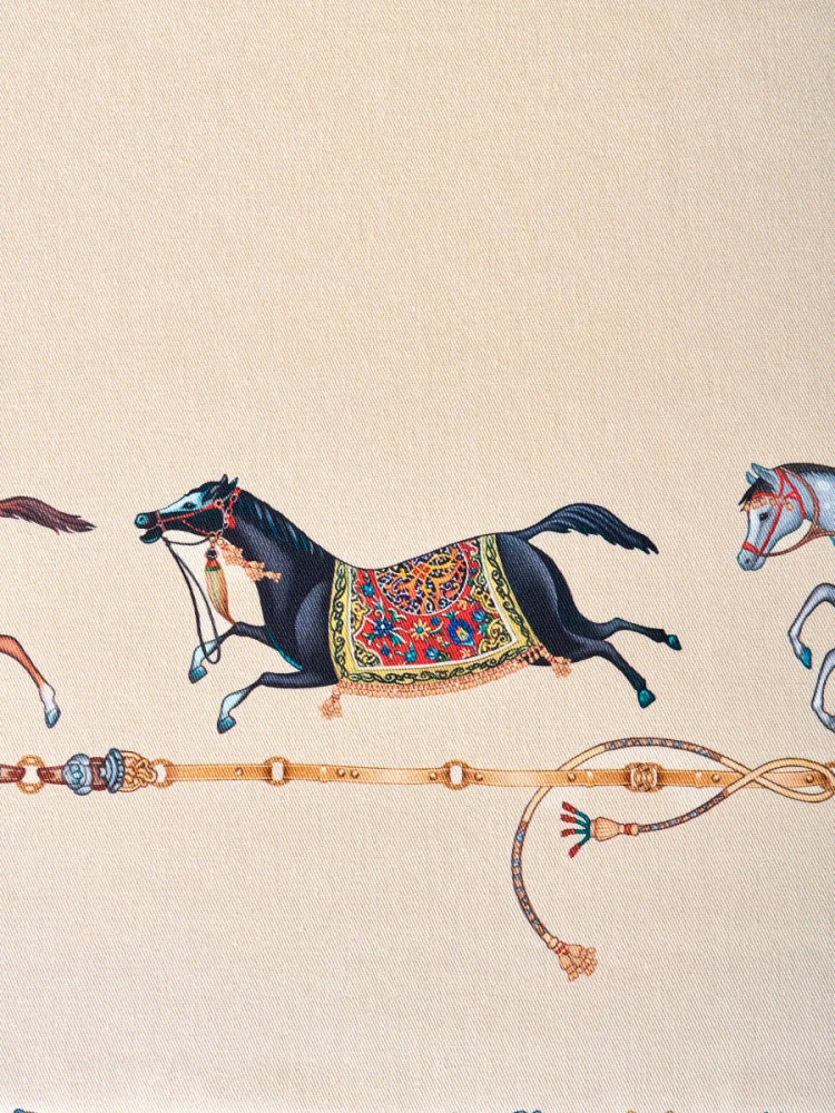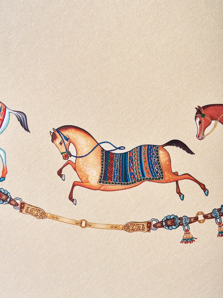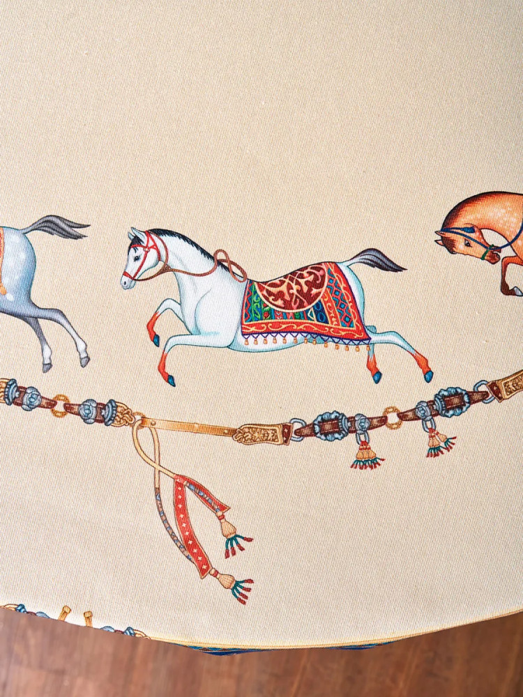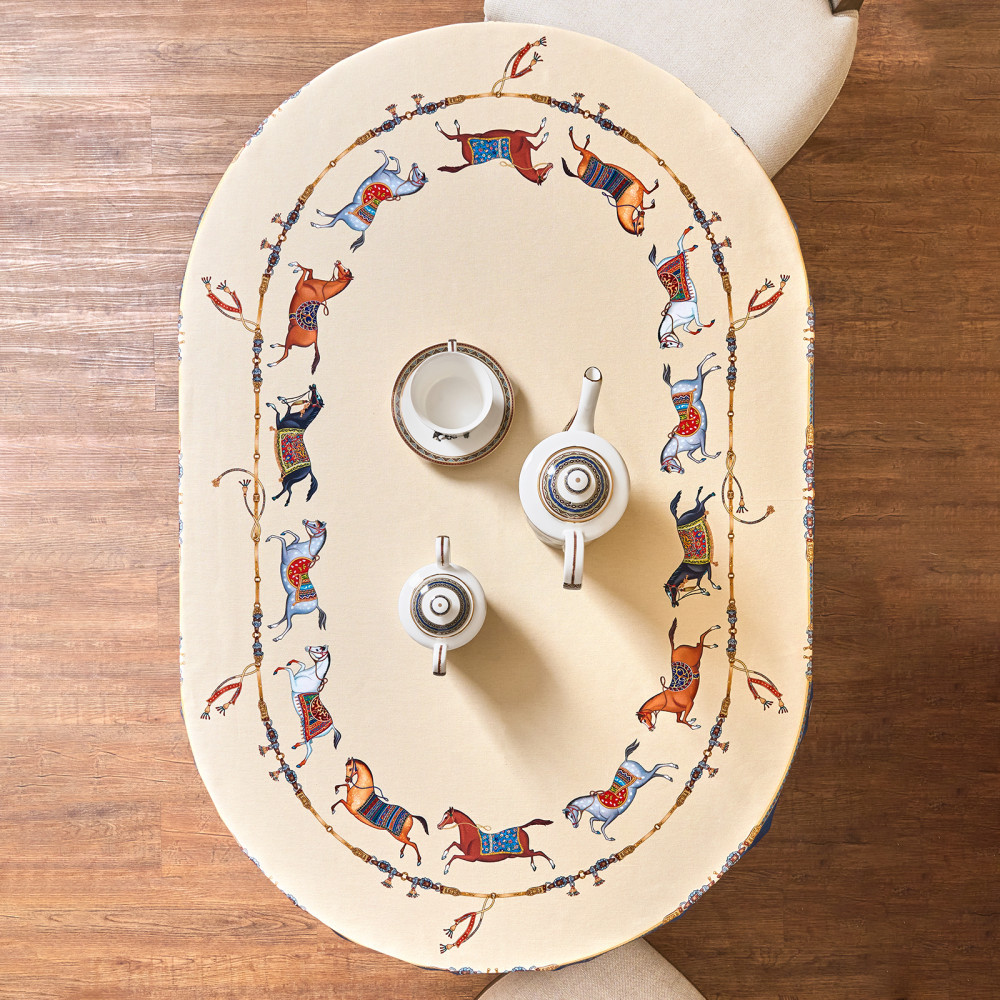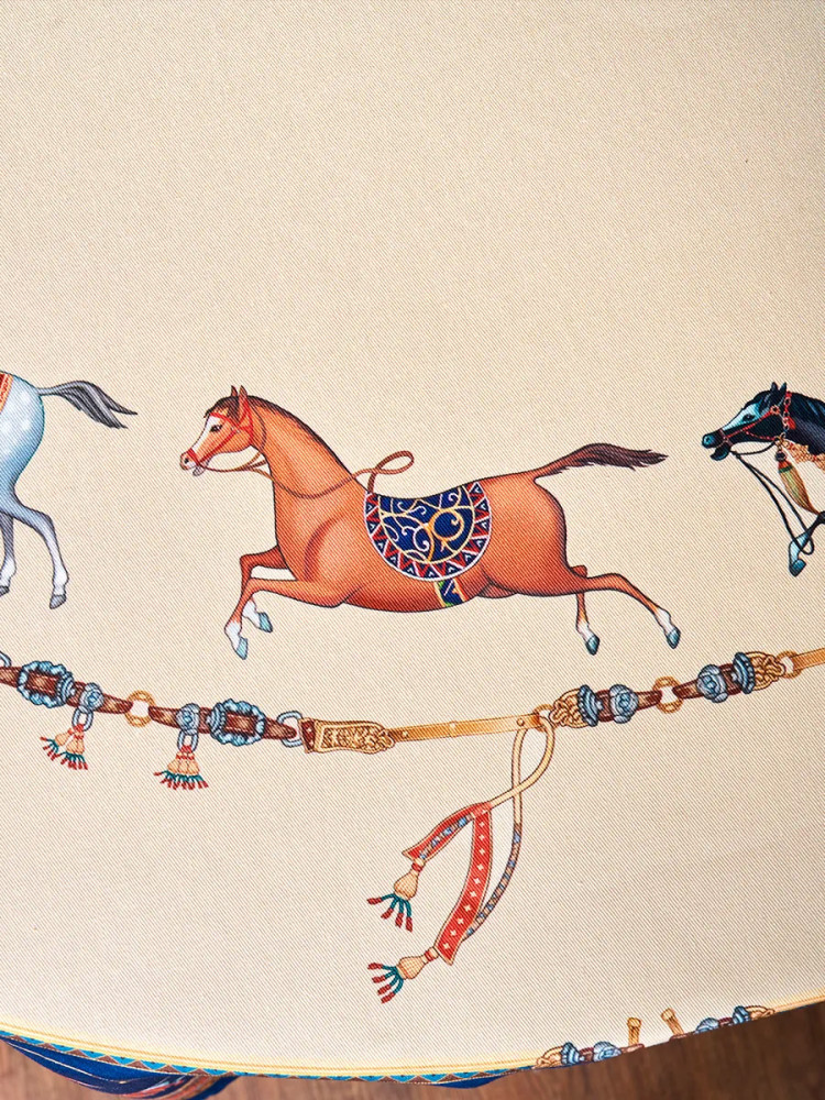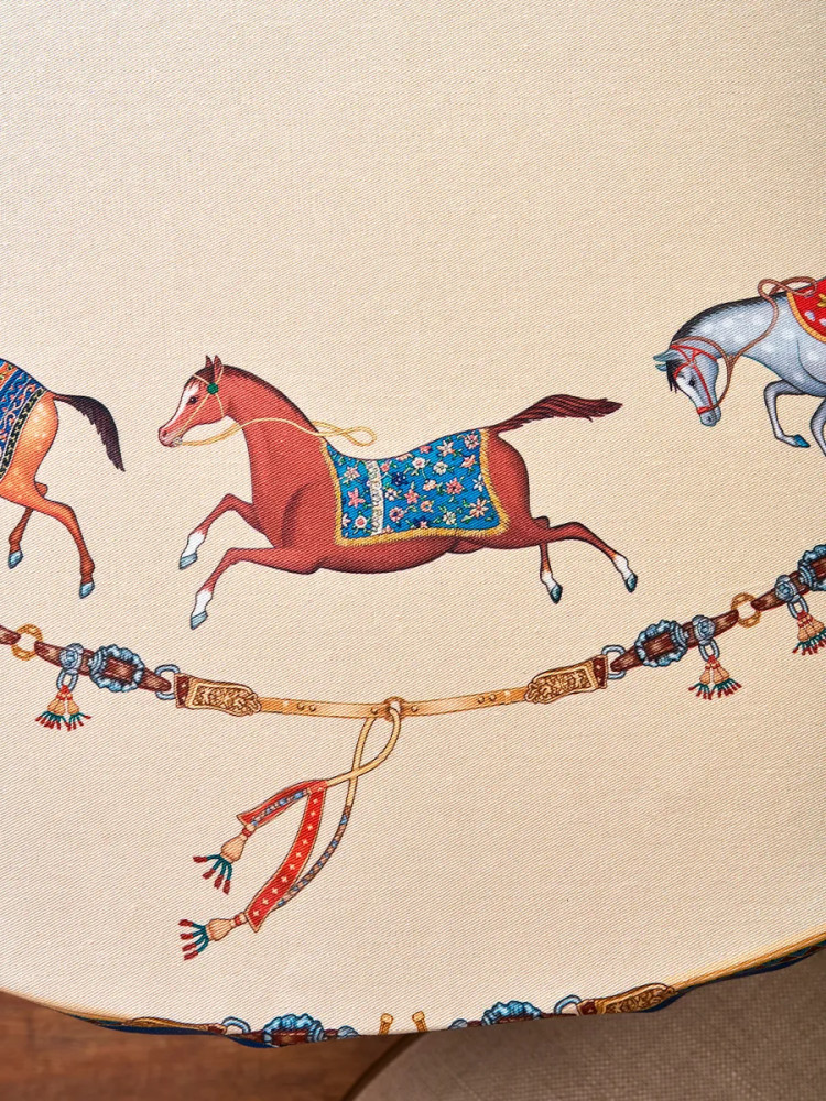 Благородный тёмно-синий фон украшен орнаментом с грациозными лошадьми, создавая атмосферу восточной роскоши. Лошадь — символ 2026 года, поэтому скатерть будет актуальна как для ежедневного использования в интерьере в стиле бохо, так и для праздничной сервировки. Авторский принт разработан художниками эксклюзивно для Lefard и нанесён методом цифровой печати, что гарантирует яркость и стойкость красок даже после множества стирок. Производство находится в России, мы относимся с любовью к каждому товару, ровные и аккуратные швы порадуют Вас. Мы рады производить текстиль высокого качества.