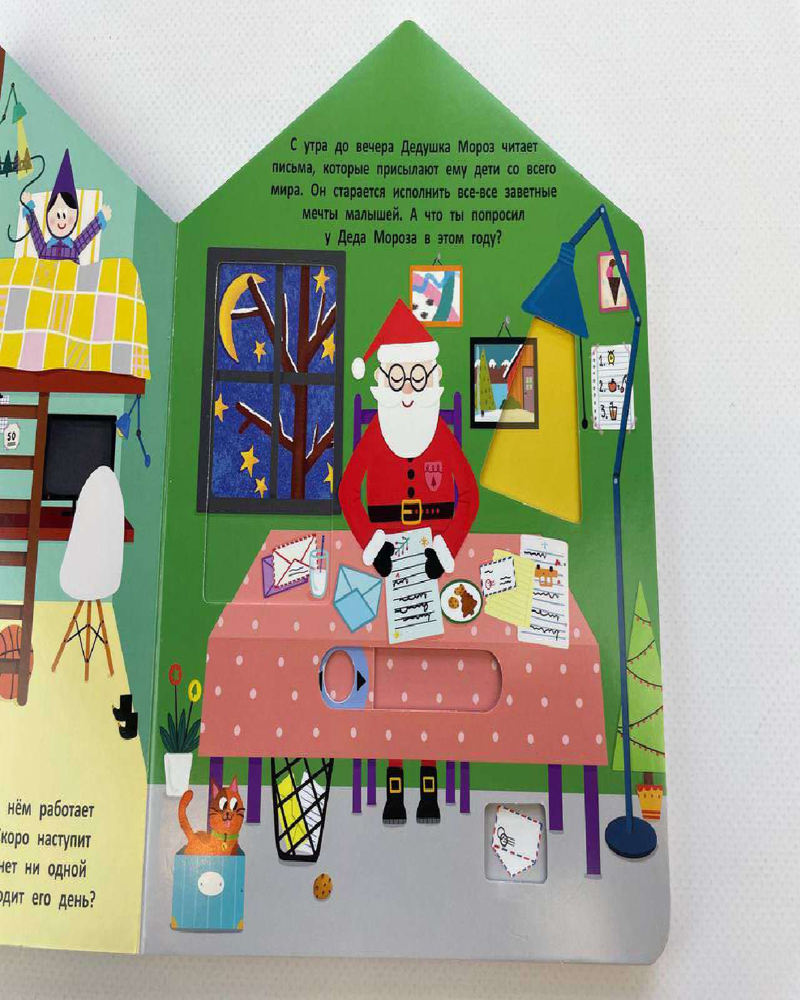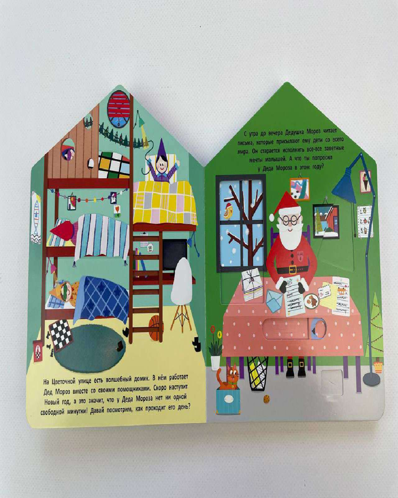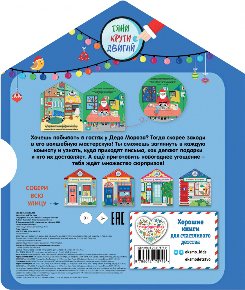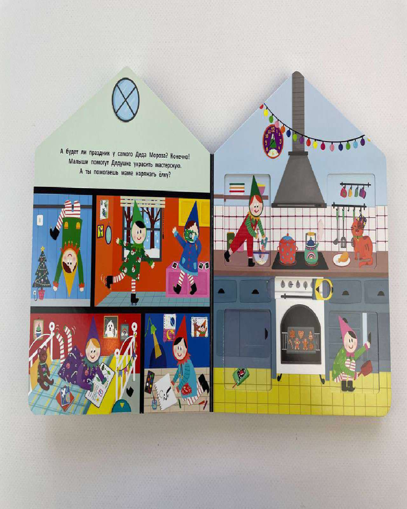 Серия: Pop-up панорамки Добро пожаловать в мастерскую Деда Мороза! В этой интерактивной книжке-игрушке много сюрпризов: малыш сможет заглянуть в каждую комнату домика и узнать, куда приходят письма для Дедушки Мороза, как делаются подарки и кто их доставляет. А ещё приготовить новогоднее угощение! Интерактивные элементы помогают развивать мелкую моторику. Ребёнок сможет потянуть, покрутить и подвигать детали, тренируя пальчики. Книжки-игрушки предназначены для детей до 3-х лет, их приятно читать перед сном. Яркие иллюстрации, необычный формат и качественные материалы делают книгу отличным подарком по любому поводу. Соберите всю серию книжек-домиков Цветочной улицы: «В гостях у Бегемотика», «В гостях у Кролика», «В гостях у Жирафика», «В гостях у Крокодильчика». |