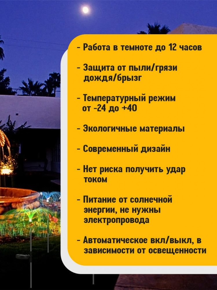 💳 Оплатить за товар можно при получении 🇰🇿 Есть бесплатная доставка по Казахстану от 1 дня 🎁 Копите бонусы с каждой покупки Добавьте в свой сад нотку волшебства с уличным светильником. Изящный дизайн с переливающимися оптоволоконными нитями создает эффект сияющих капель, будто лёгкое дыхание ветра превращает ночь в сказку. Светильник работает от солнечной батареи — никакого электричества, проводов и забот. |