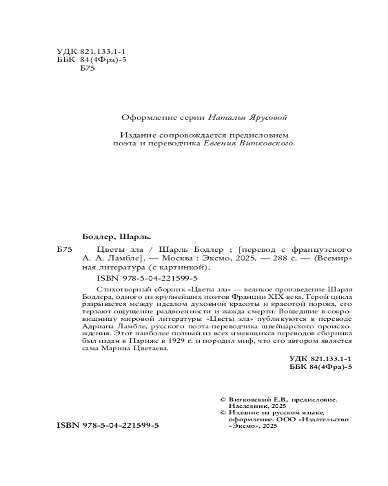 💳 Оплатить за товар можно при получении 🇰🇿 Есть бесплатная доставка по Казахстану от 1 дня 🎁 Копите бонусы с каждой покупки Серия: Всемирная литература (новое оформление) Стихотворный сборник «Цветы зла» — великое произведение Шарля Бодлера, одного из крупнейших поэтов Франции XIX века. Герой цикла разрывается между идеалом духовной красоты и красотой порока, его терзает ощущение раздвоенности и жажда смерти. Вошедшие в сокровищницу мировой литературы «Цветы зла» публикуются в переводе Адриана Ламбле, русского поэта-переводчика швейцарского происхождения. Этот наиболее полный из всех имеющихся переводов сборника был издан в Париже в 1929 г. и породил миф, что его автором является сама Марина Цветаева. |