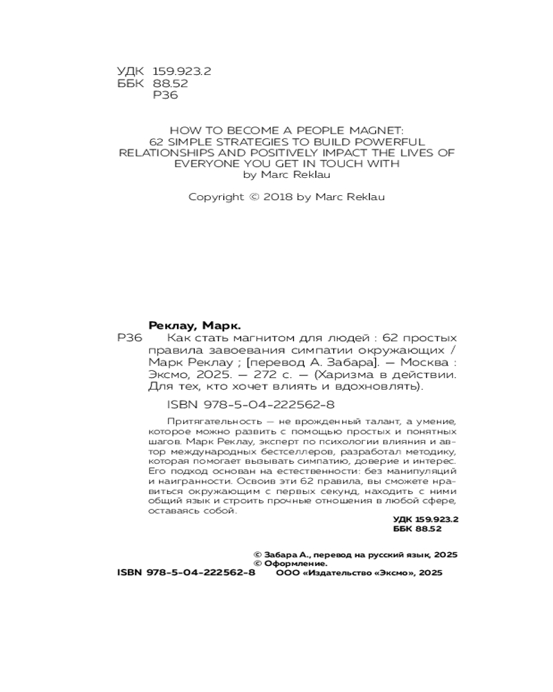💳 Оплатить за товар можно при получении 🇰🇿 Есть бесплатная доставка по Казахстану от 1 дня 🎁 Копите бонусы с каждой покупки Серия: Харизма в действии. Для тех, кто хочет влиять и вдохновлять Притягивать людей легче, чем кажется. Это не волшебство и не дар избранных. Достаточно понять систему простых приемов, чтобы производить неизгладимое впечатление на окружающих. Методика Марка Реклау, эксперта в области психологии влияния и автора бестселлеров по коммуникациям, помогла сотням тысяч людей по всему миру научиться выстраивать прочные отношения через естественную притягательность. Марк не учит манипулировать. Он помогает включить ваш внутренний магнит. |