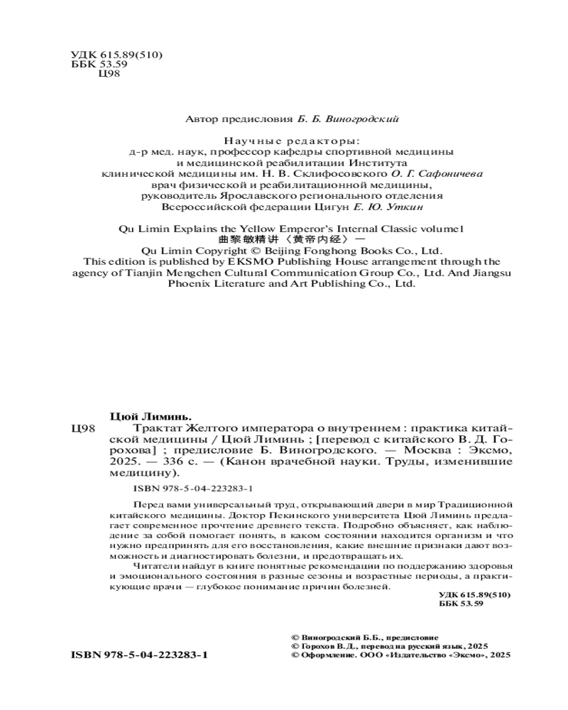 💳 Оплатить за товар можно при получении 🇰🇿 Есть бесплатная доставка по Казахстану от 1 дня 🎁 Копите бонусы с каждой покупки Серия: Канон врачебной науки. Труды, изменившие медицину Здоровье — это не только поддержание тела, но и питание сердца и разума. Книга профессора Цюй Лиминь — бестселлер, изданный миллионным тиражом, увлекательное путешествие в мир мудрости, где философия, медицина и космология соединяются в единое целое. Автор предлагает построчные комментарии к самому древнему из сохранившихся, классическому труду, посвященному медицине и метафизике. «Трактат Желтого императора о внутреннем» заложил теоретическую основу для дальнейшего развития медицины Китая, обобщив опыт древних врачей и став для последующих поколений как учебником, так и настольной энциклопедией. Яркий и интересный язык автора упрощает понимание глубоких текстов, перекладывая его суть на жизнь современных людей. |