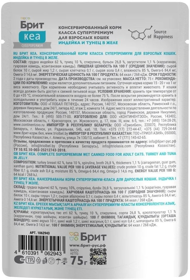 Brit Корм влажный для взрослых кошек «Индейка и тунец в желе»