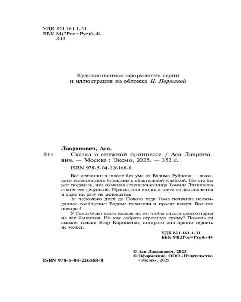 💳 Оплатить за товар можно при получении 🇰🇿 Есть бесплатная доставка по Казахстану от 1 дня 🎁 Копите бонусы с каждой покупки Серия: Магистраль. Ася Лавринович Все девчонки в школе без ума от Вадима Рубцова — высокого зеленоглазого блондина с обаятельной улыбкой. Но кто бы мог подумать, что обычная старшеклассница Томила Литвинова станет его девушкой. Правда, они сходили всего на два свидания и даже ни разу не целовались. За несколько дней до Нового года Тома получила неожиданное сообщение: Вадима похитили и просят выкуп. Вот так поворот! У Томы будет всего неделя на то, чтобы спасти своего парня из лап бандитов. Но как собрать огромную сумму? Помочь ей сможет только Егор Корниенко, которого она просто терпеть не может. |