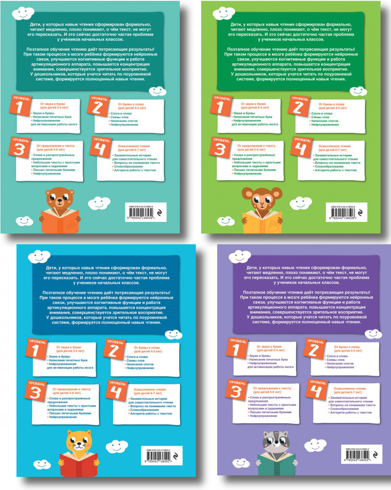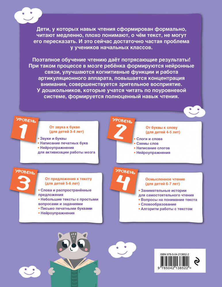 Серия: Поуровневая автоматизация навыка чтения Важно пройти все основные уровни обучения, ничего не пропуская, чтобы довести навык чтения до автоматизма. Комплект развивающих книг от издательства «Эксмо» поможет в этом вашему малышу! Он состоит из четырех книг, которые поэтапно помогут освоить навык чтения: от изучения букв и слогов до чтения предложений и текстов! Методика, учитывающая нейропсихологические аспекты, гарантирует высокий результат. Книга адресована заботливым родителям и педагогам, занимающимся развитием и подготовкой детей к школе. |