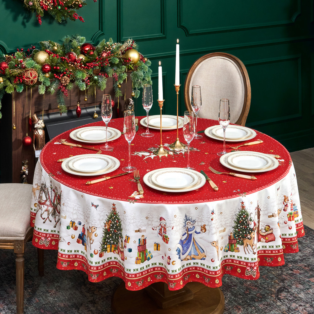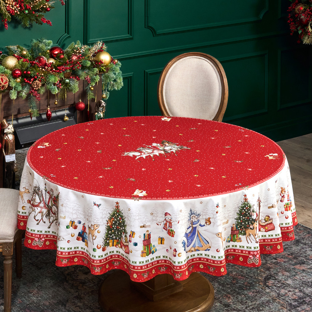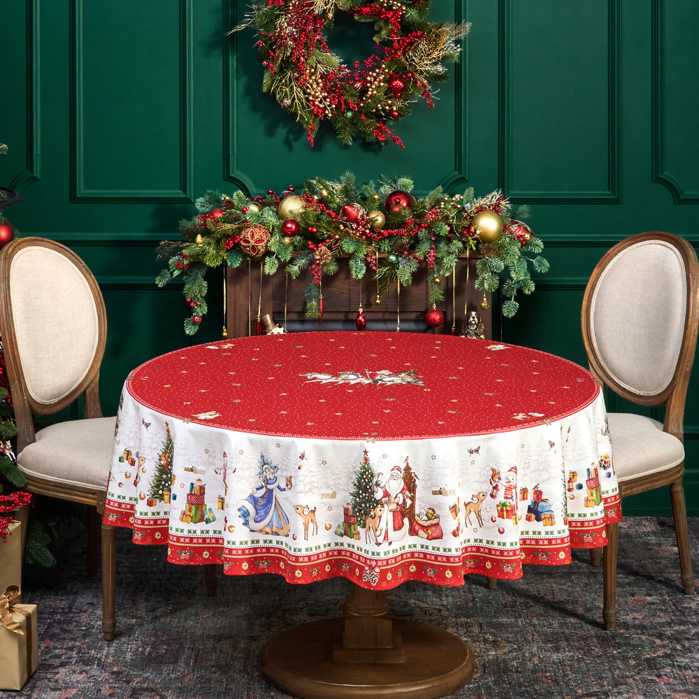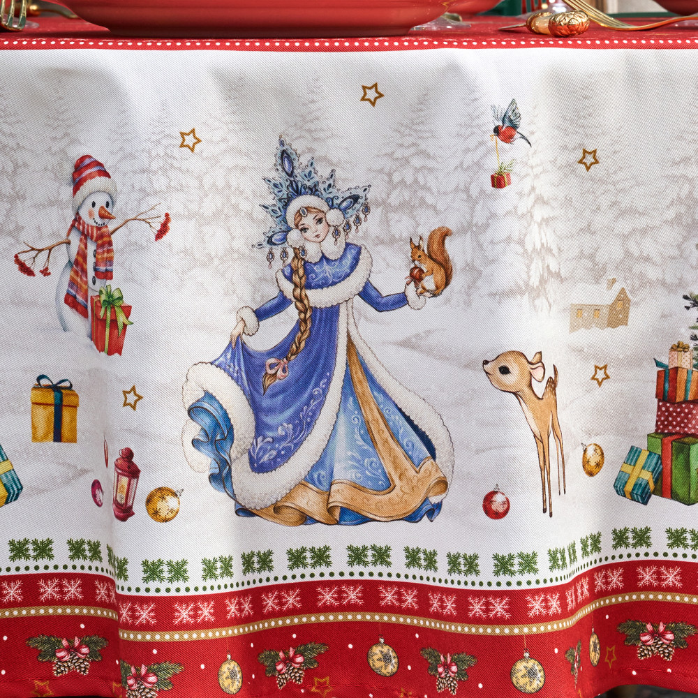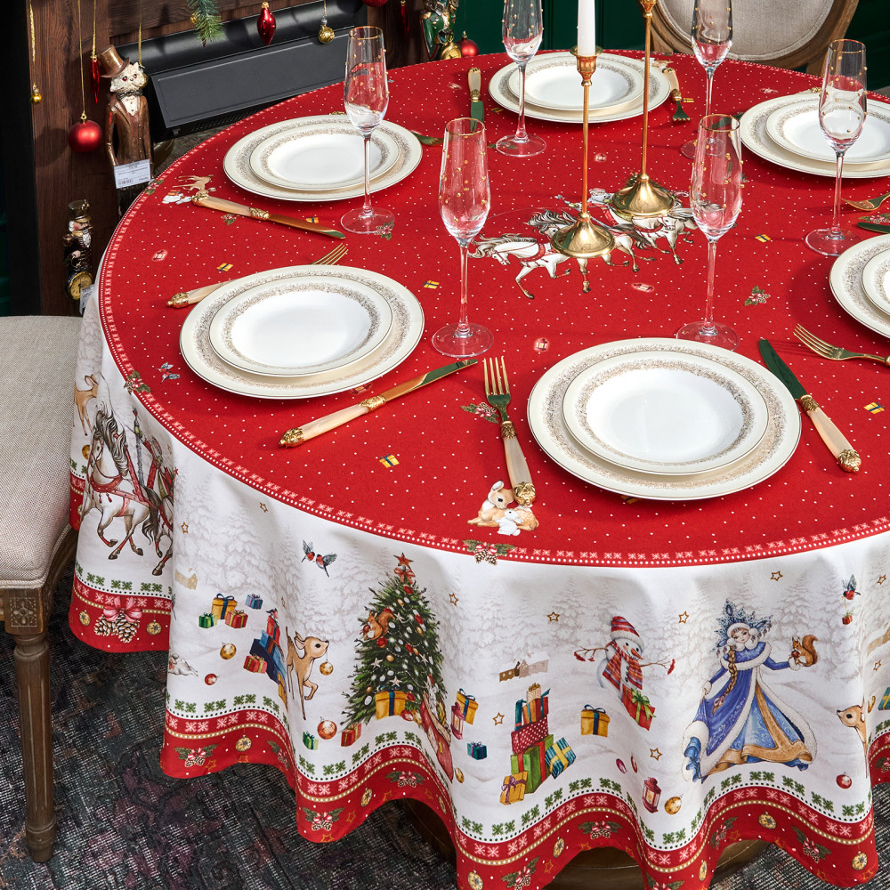 Новогодняя, скатерть на круглый стол из коллекции С Новым Годом от бренда Lefard — стильное и практичное решение для кухни, гостиной или праздничного интерьера. Изготовлена из 100% хлопка с водоотталкивающей пропиткой: ткань защищает поверхность от влаги и загрязнений, легко очищается и быстро сохнет. Диаметр скатерти — 190 см, она подходит для круглых столов диаметром от 100, 110,120, 130 см, обеспечивая эстетичный свес 20–45 см в зависимости от размера столешницы. Плотная хлопковая ткань устойчива к износу и частым стиркам, а качественная цифровая печать сохраняет чёткость рисунка даже при активной эксплуатации.