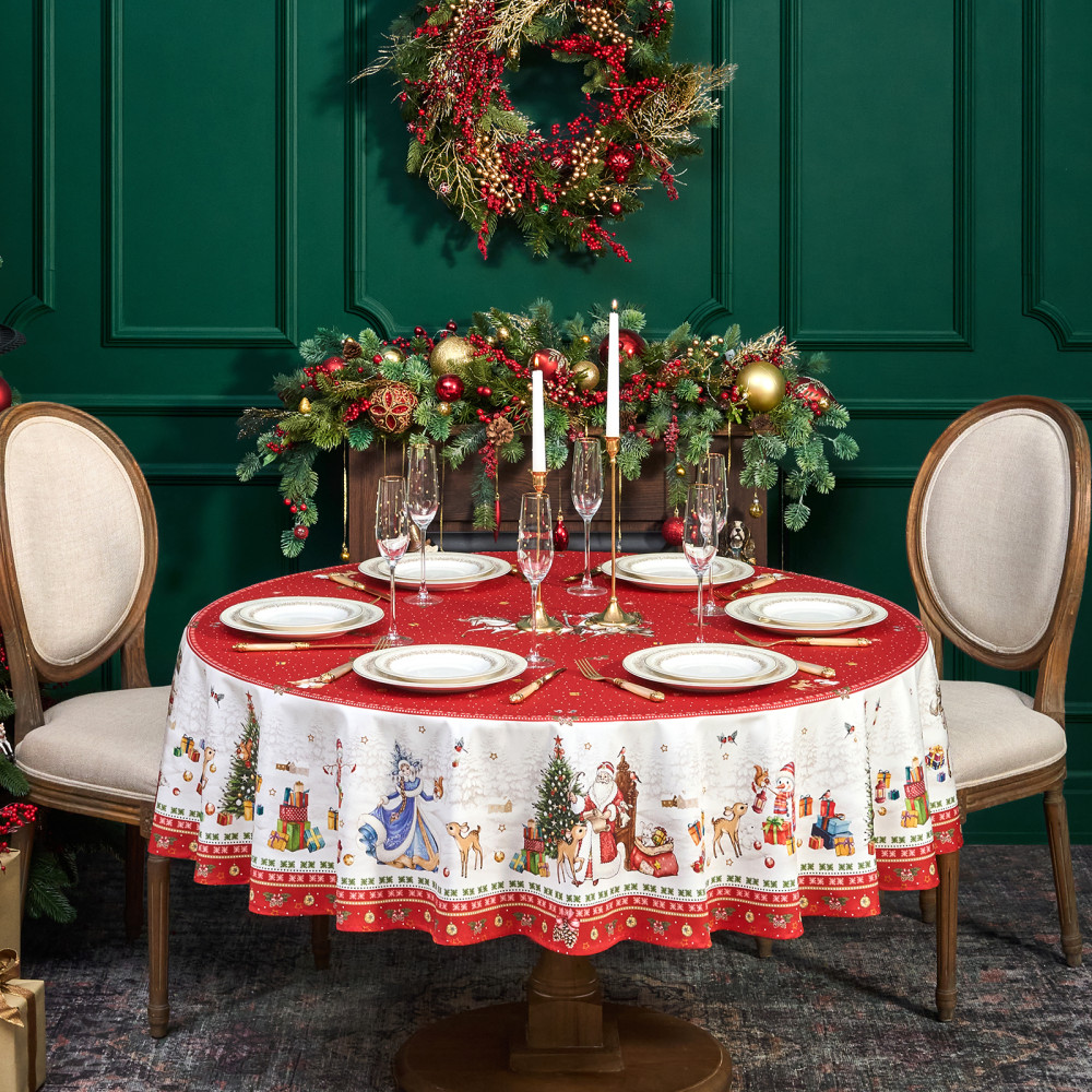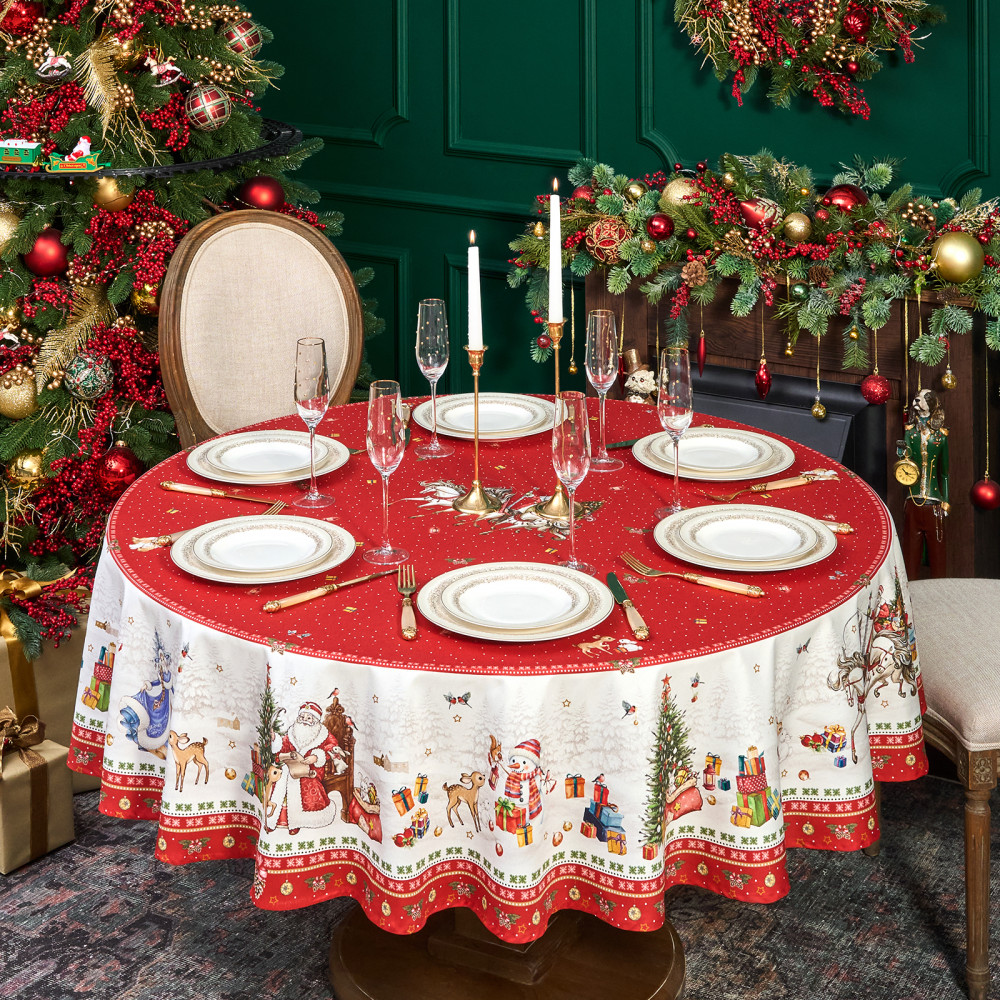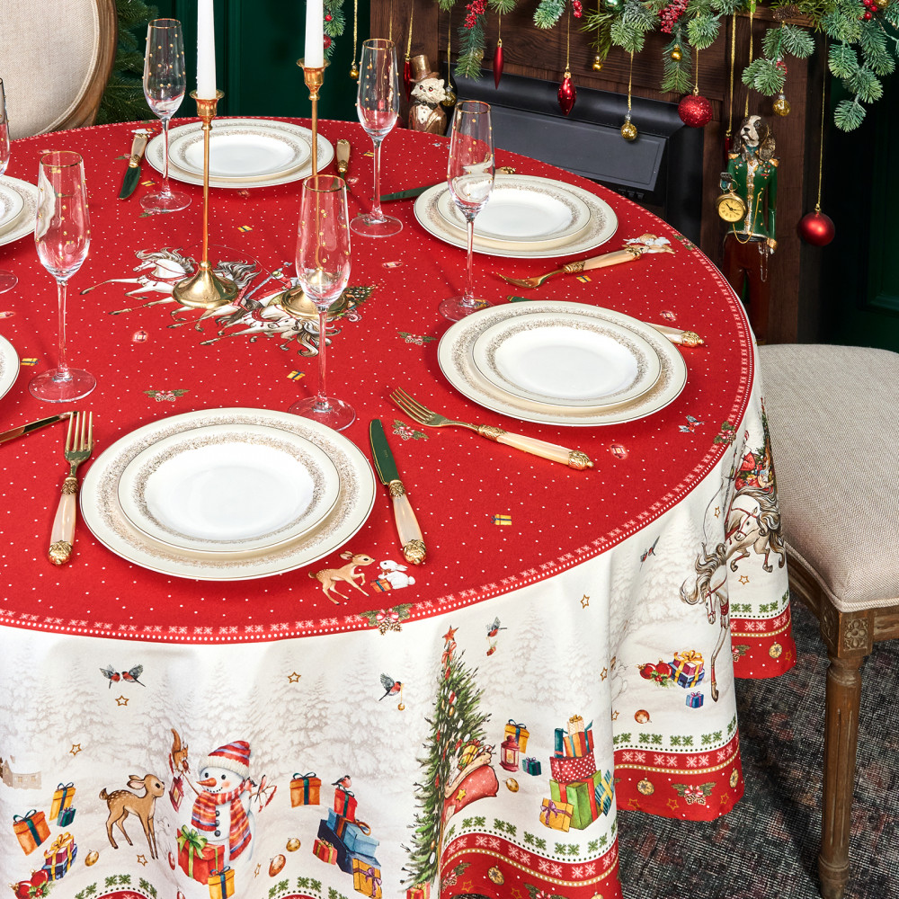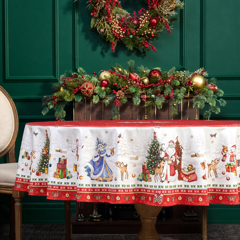 Новогодняя, скатерть на круглый стол из коллекции С Новым Годом от бренда Lefard — стильное и практичное решение для кухни, гостиной или праздничного интерьера. Изготовлена из 100% хлопка с водоотталкивающей пропиткой: ткань защищает поверхность от влаги и загрязнений, легко очищается и быстро сохнет. Диаметр скатерти — 190 см, она подходит для круглых столов диаметром от 100, 110,120, 130 см, обеспечивая эстетичный свес 20–45 см в зависимости от размера столешницы. Плотная хлопковая ткань устойчива к износу и частым стиркам, а качественная цифровая печать сохраняет чёткость рисунка даже при активной эксплуатации.