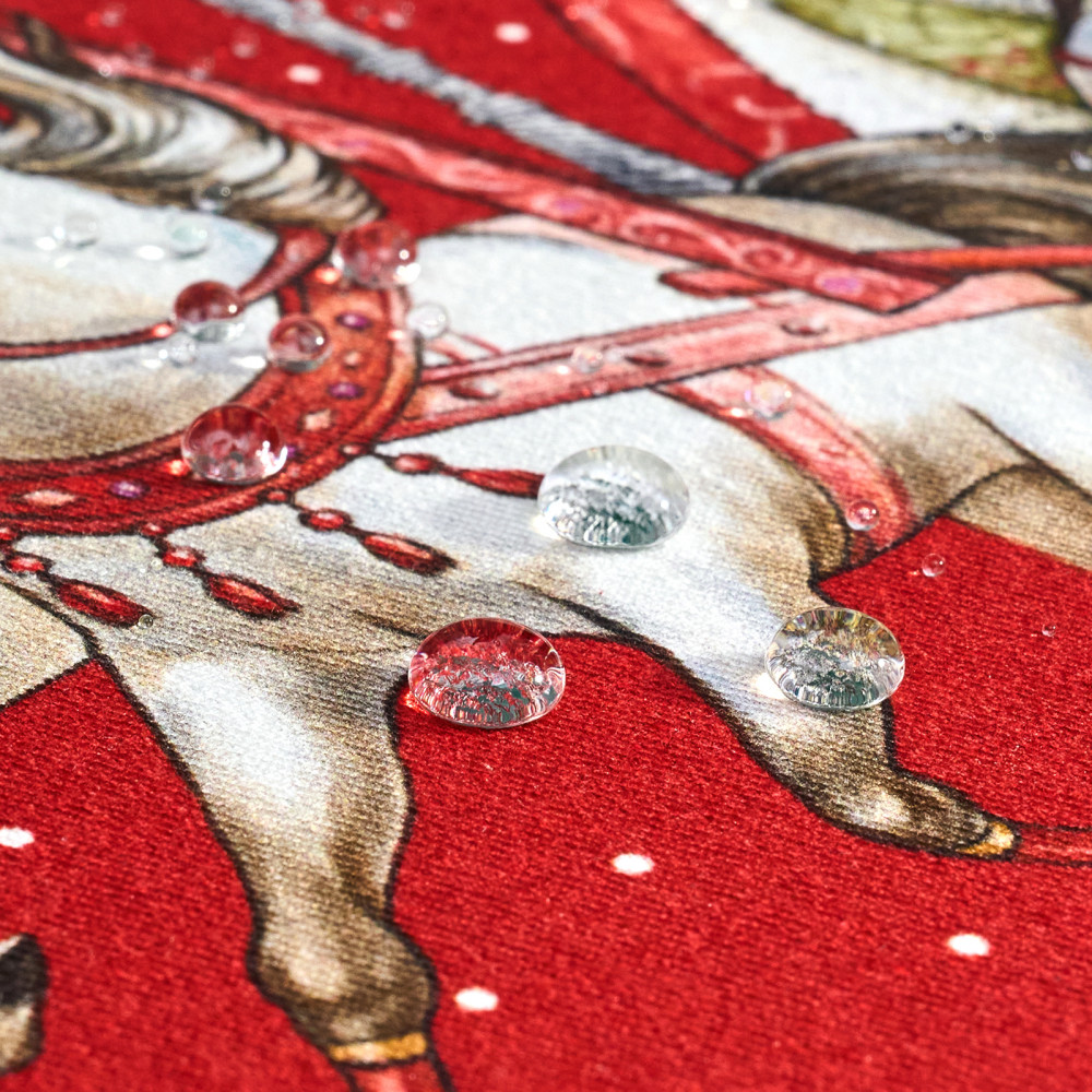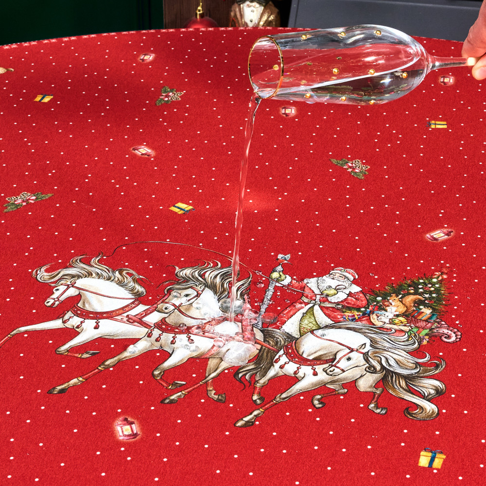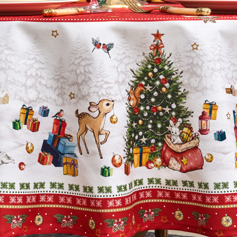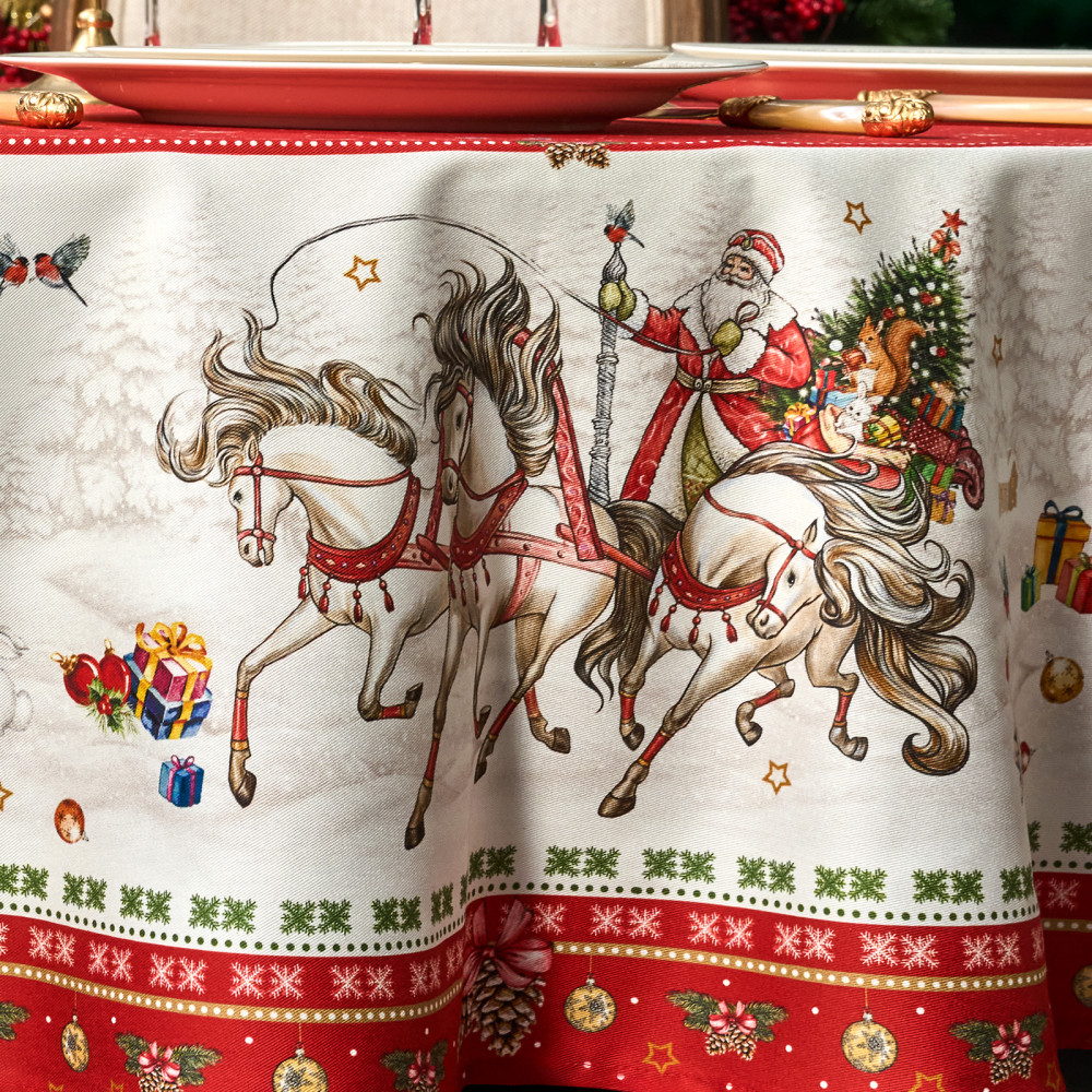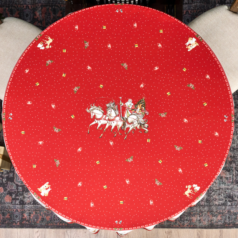 Новогодняя, скатерть на круглый стол из коллекции С Новым Годом от бренда Lefard — стильное и практичное решение для кухни, гостиной или праздничного интерьера. Изготовлена из 100% хлопка с водоотталкивающей пропиткой: ткань защищает поверхность от влаги и загрязнений, легко очищается и быстро сохнет. Диаметр скатерти — 190 см, она подходит для круглых столов диаметром от 100, 110,120, 130 см, обеспечивая эстетичный свес 20–45 см в зависимости от размера столешницы. Плотная хлопковая ткань устойчива к износу и частым стиркам, а качественная цифровая печать сохраняет чёткость рисунка даже при активной эксплуатации.